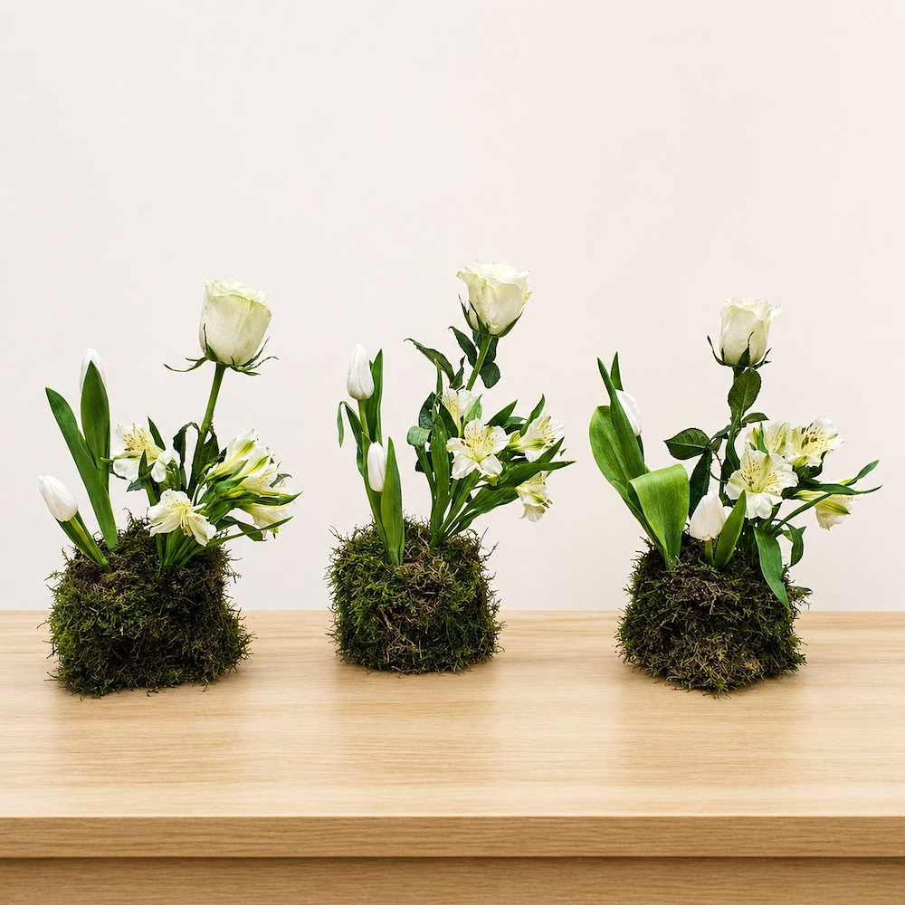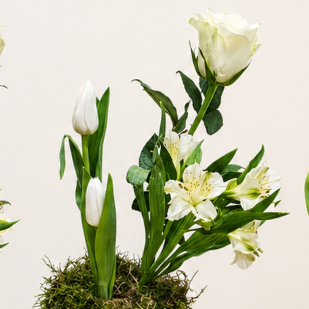 3 table centerpieces, each containing roses, tulips and alstroemeria, beautifully arranged.