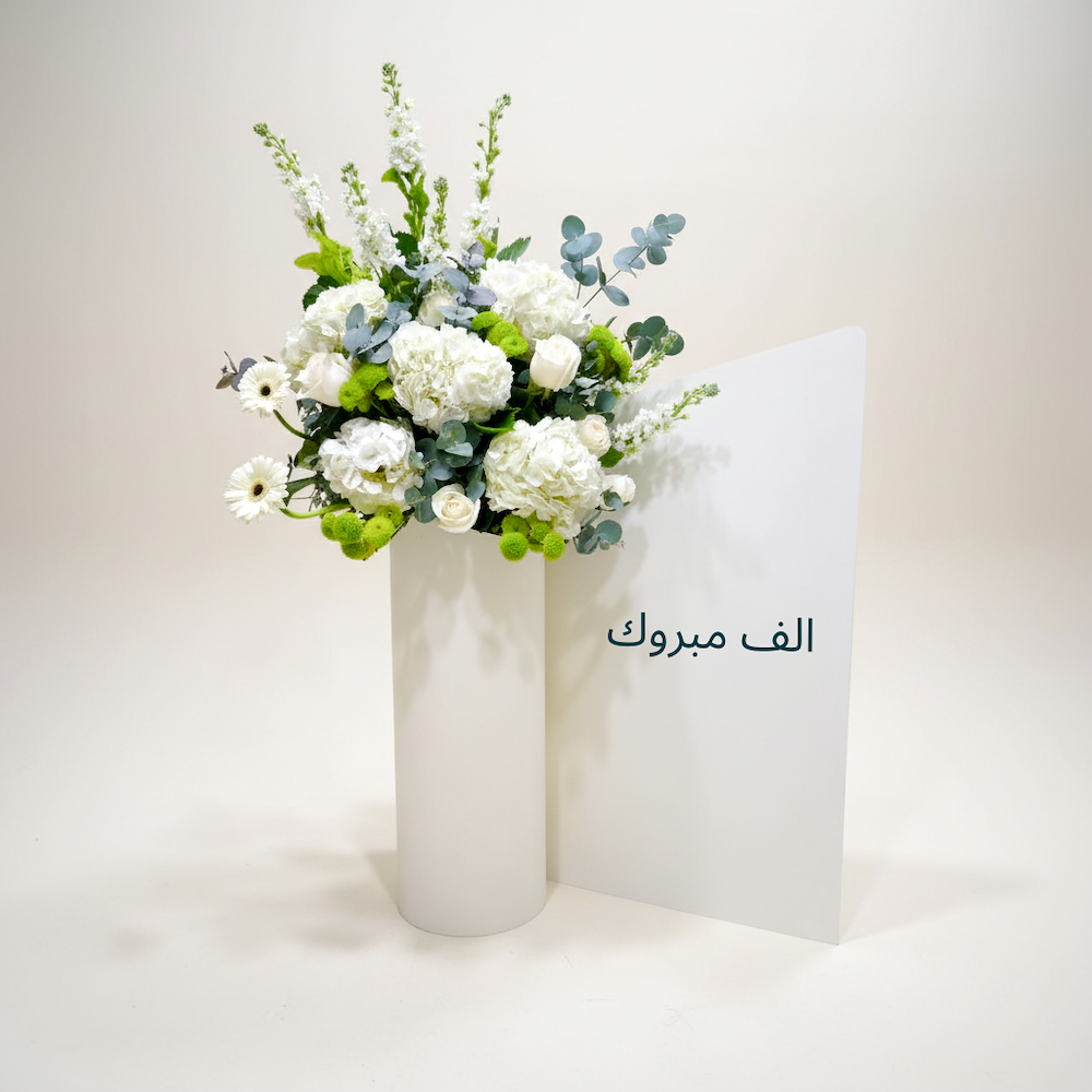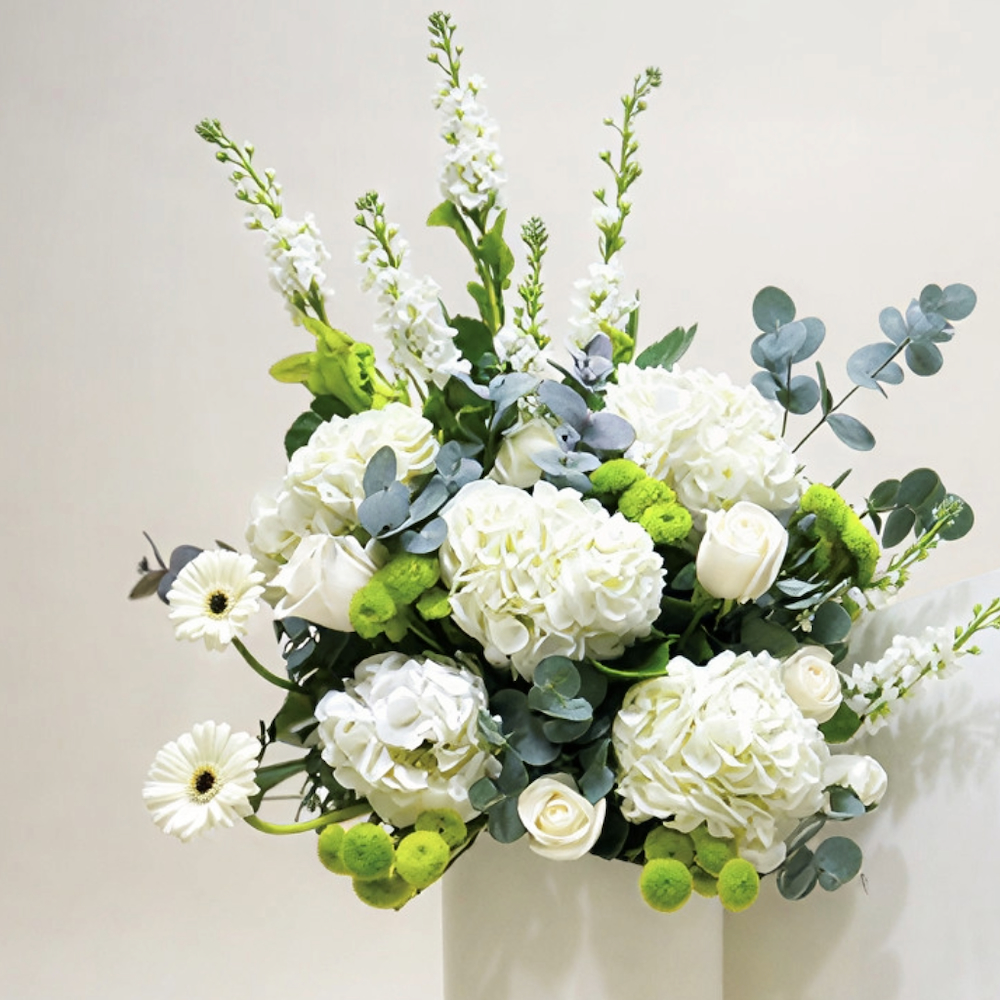 A stand made of natural flowers containing hydrangea, methola, roses, gerbera and chrysanthemum.