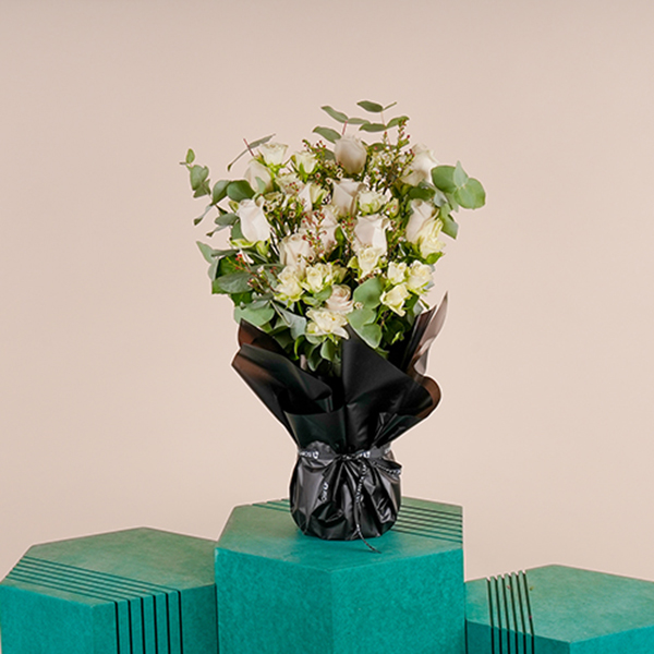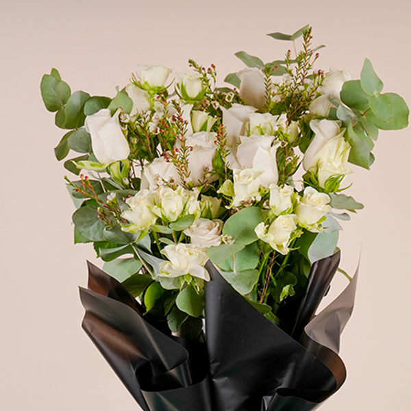 A glass vase wrapped with a black paper that contains baby roses, roses and eucalyptus.
