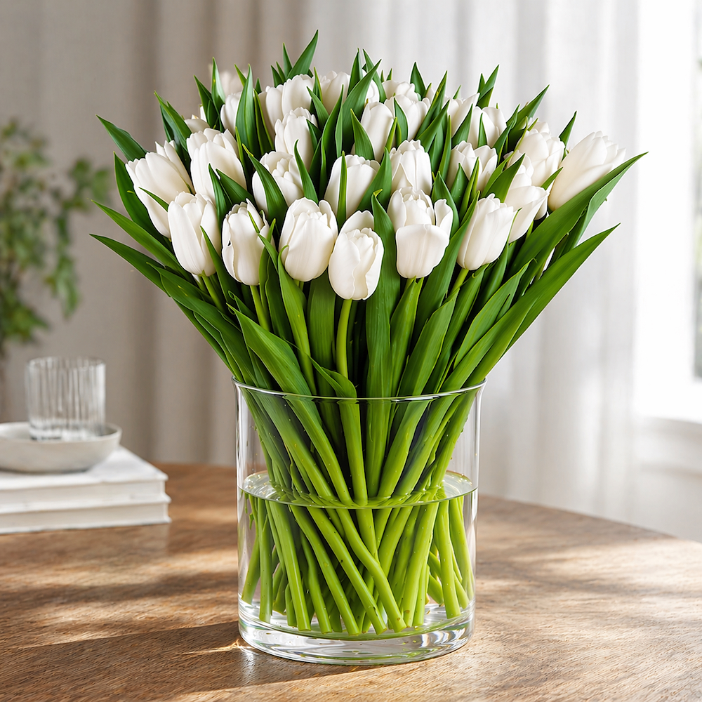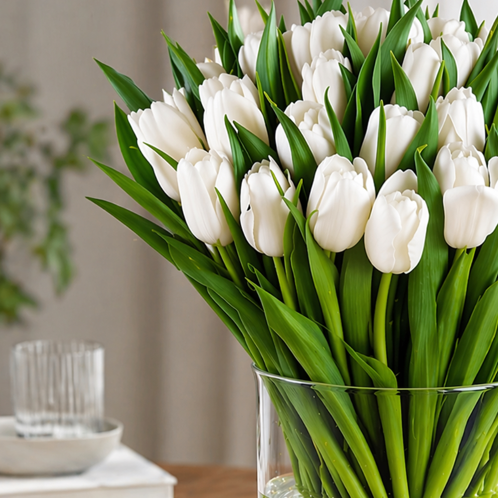 A bouquet of the finest natural tulips, 40 pieces, beautifully arranged inside a vase.