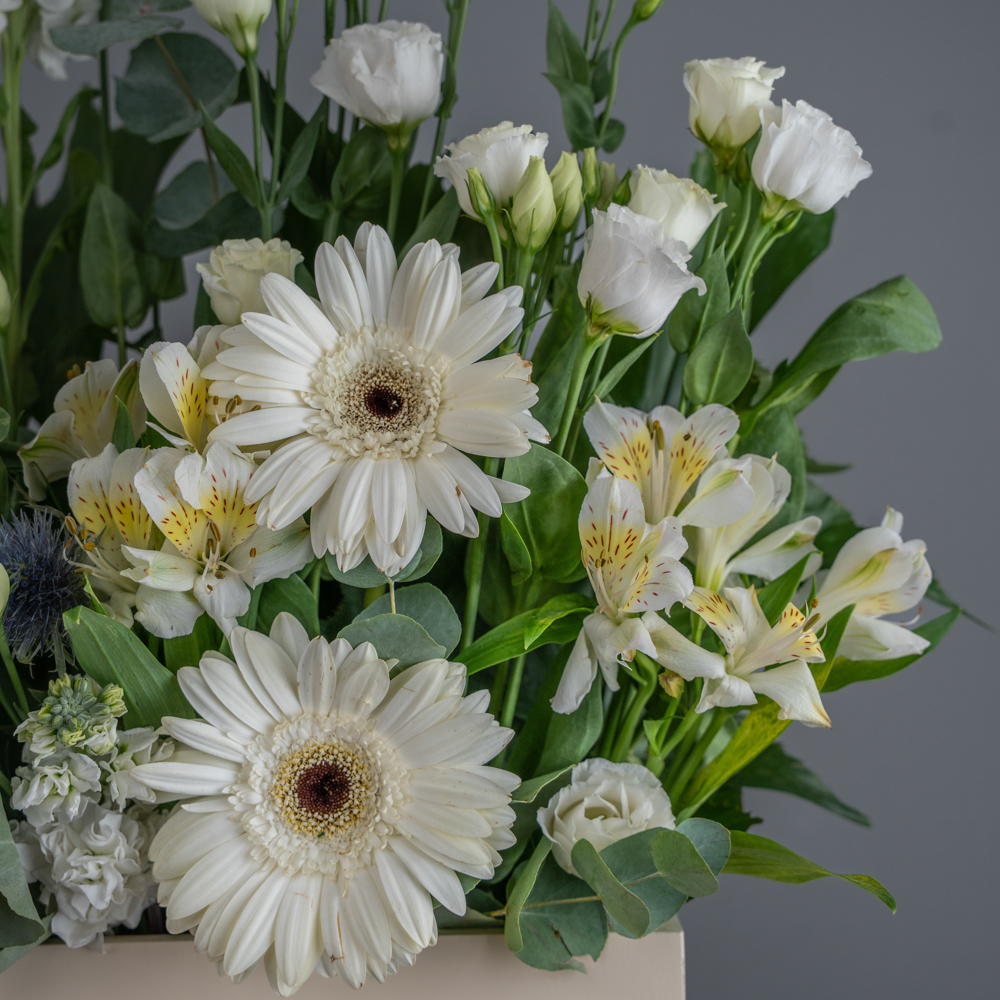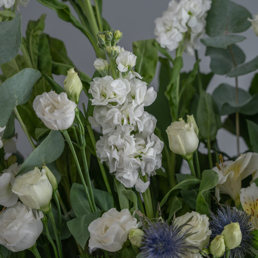 A bouquet that contains roses, baby roses, matthiolas, alstroemerias and gerberas.