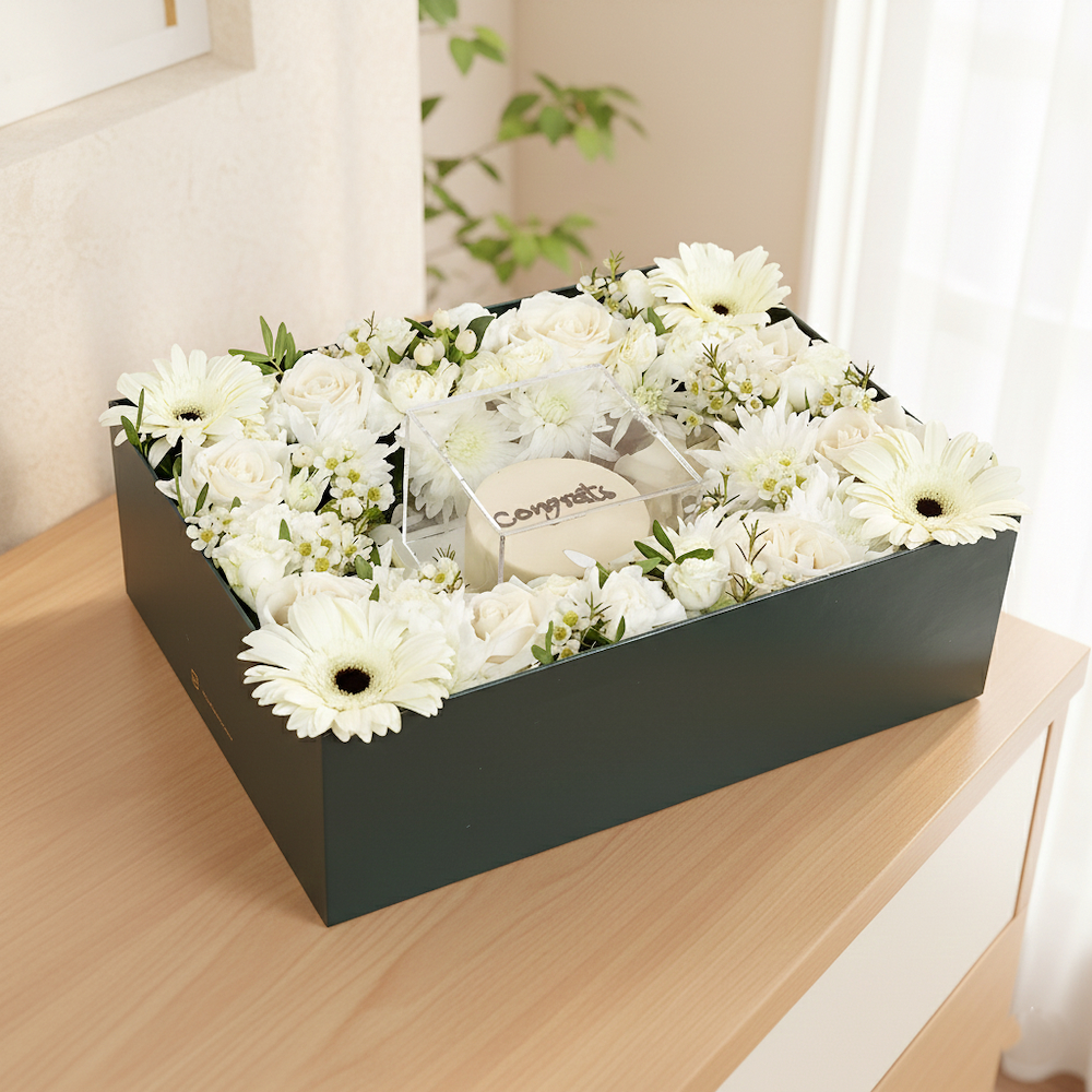 This bouquet contains roses, and gerberas with a cake.