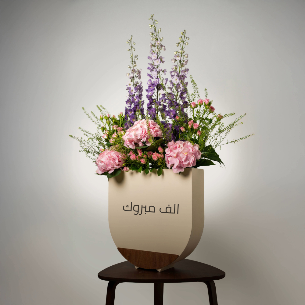 A bouquet that contains roses, hydrangeas and delphiniums.