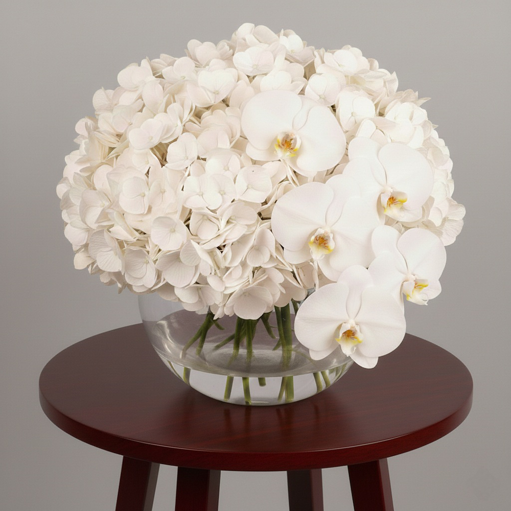 An elegantly curated bouquet consisting of hydrangeas and orchids.