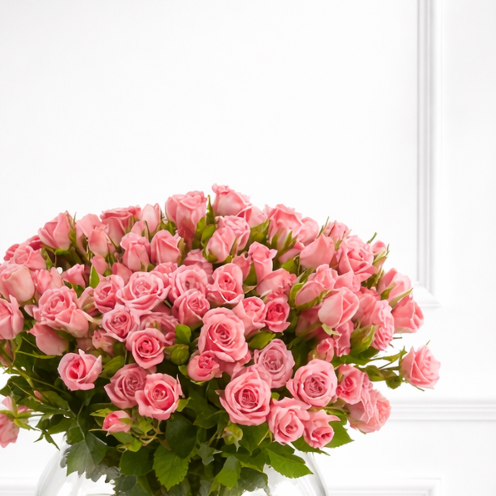 A bouquet of natural baby roses, arranged elegantly inside a vase.
