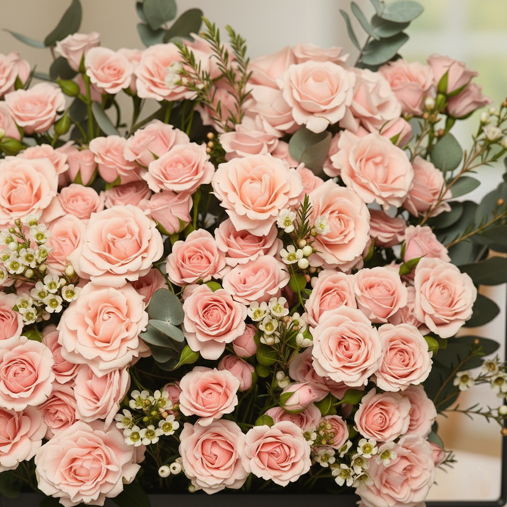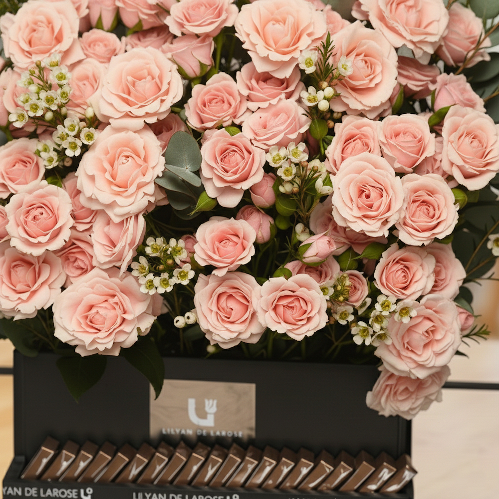 A black wooden basket with metal handle that contains baby roses, wax and eucalyptus with Belgian chocolates.