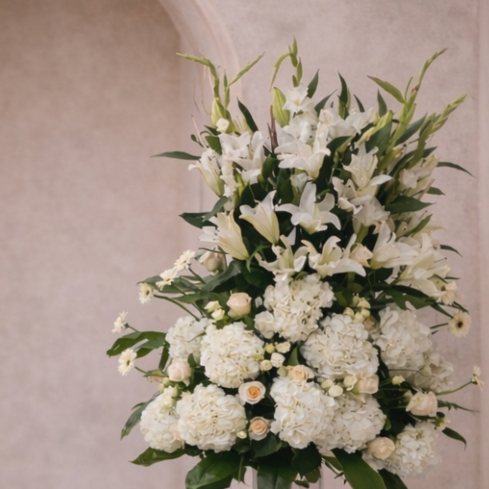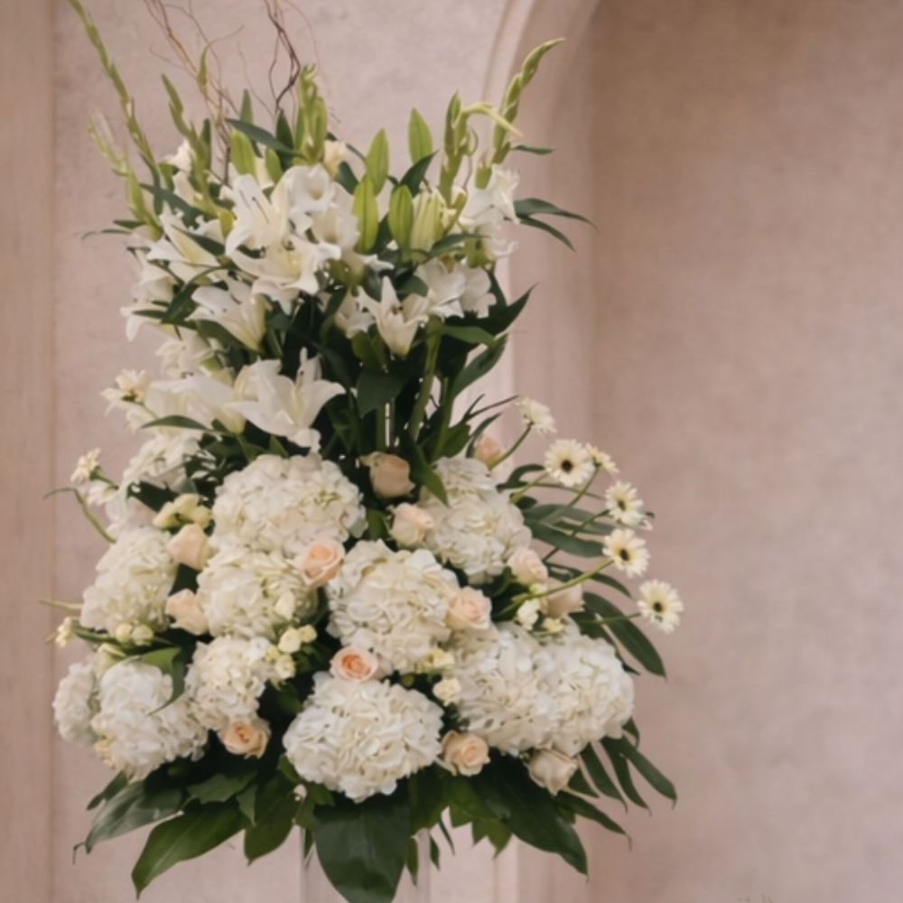 3 natural flower arrangements, 2 large VIP vases and 1 centerpiece. The arrangements consist of hydrangea, rose, baby rose, gerbera, gladiolus, and casablanca flowers.