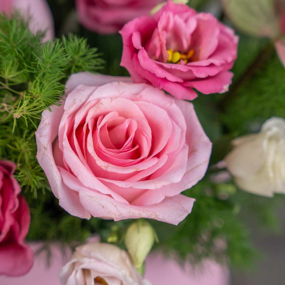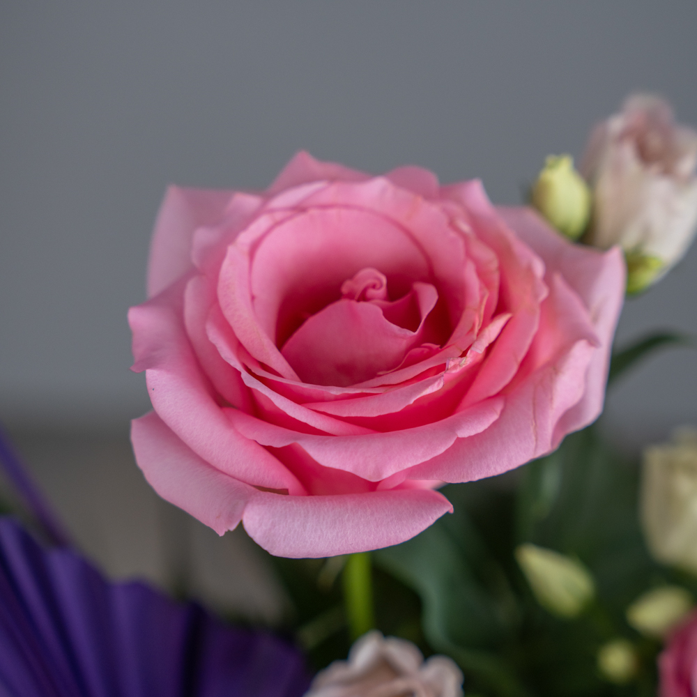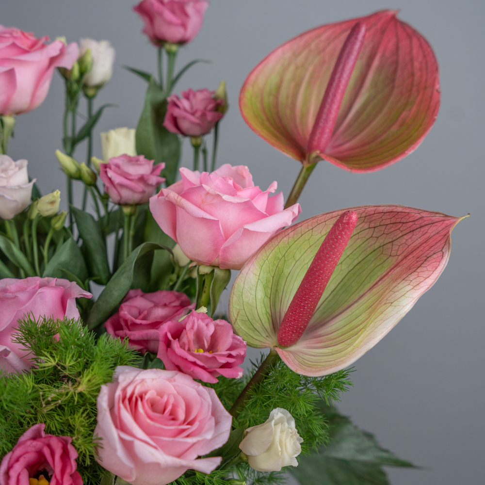 A bouquet that contains roses, eustoma, and anthuriums.