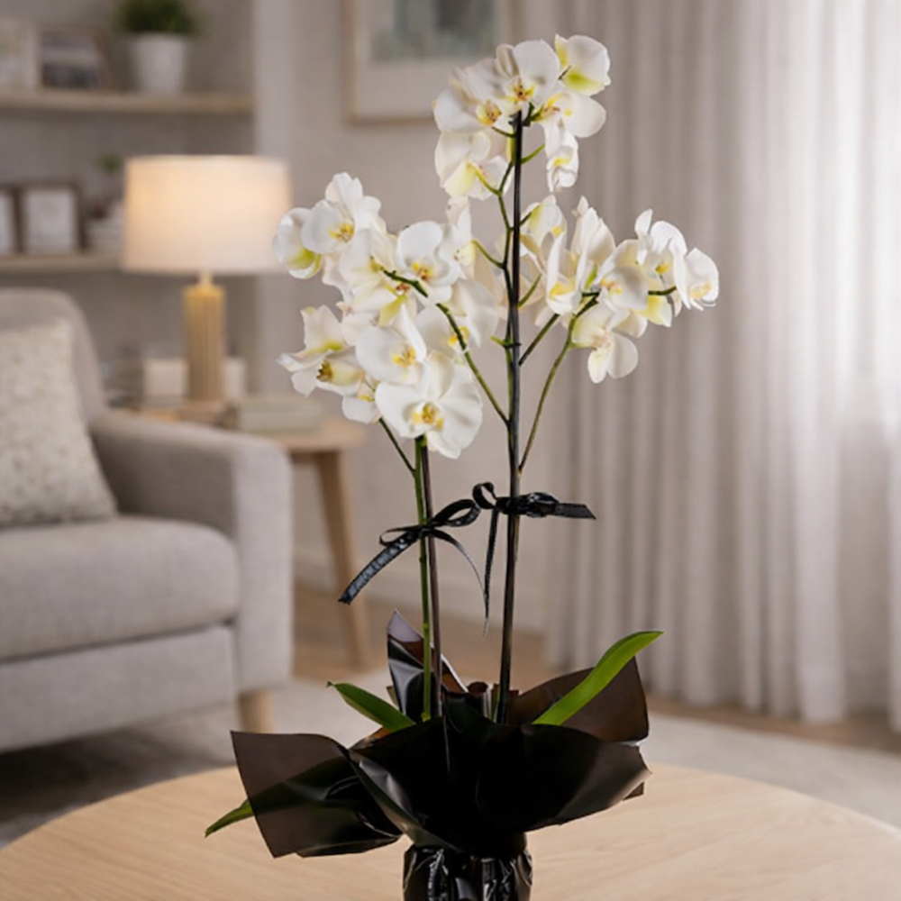 This bouquet contains an orchid plant, arranged beautifully.