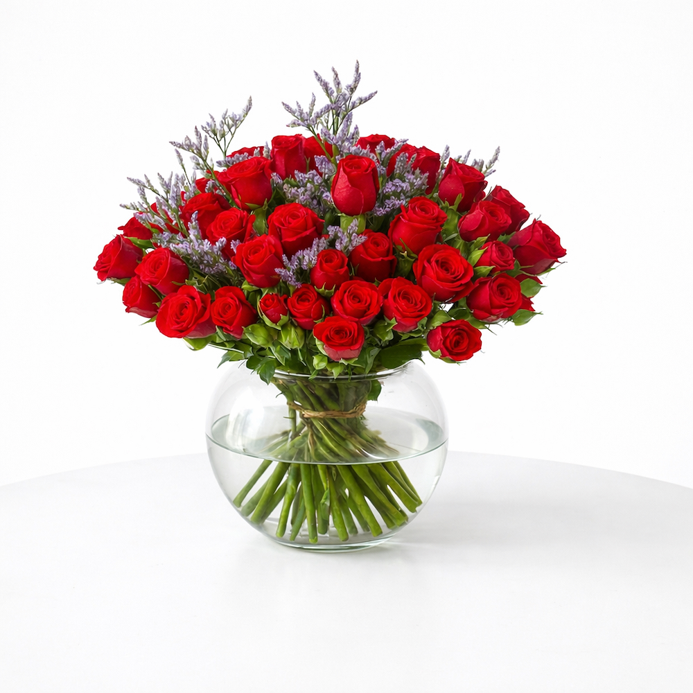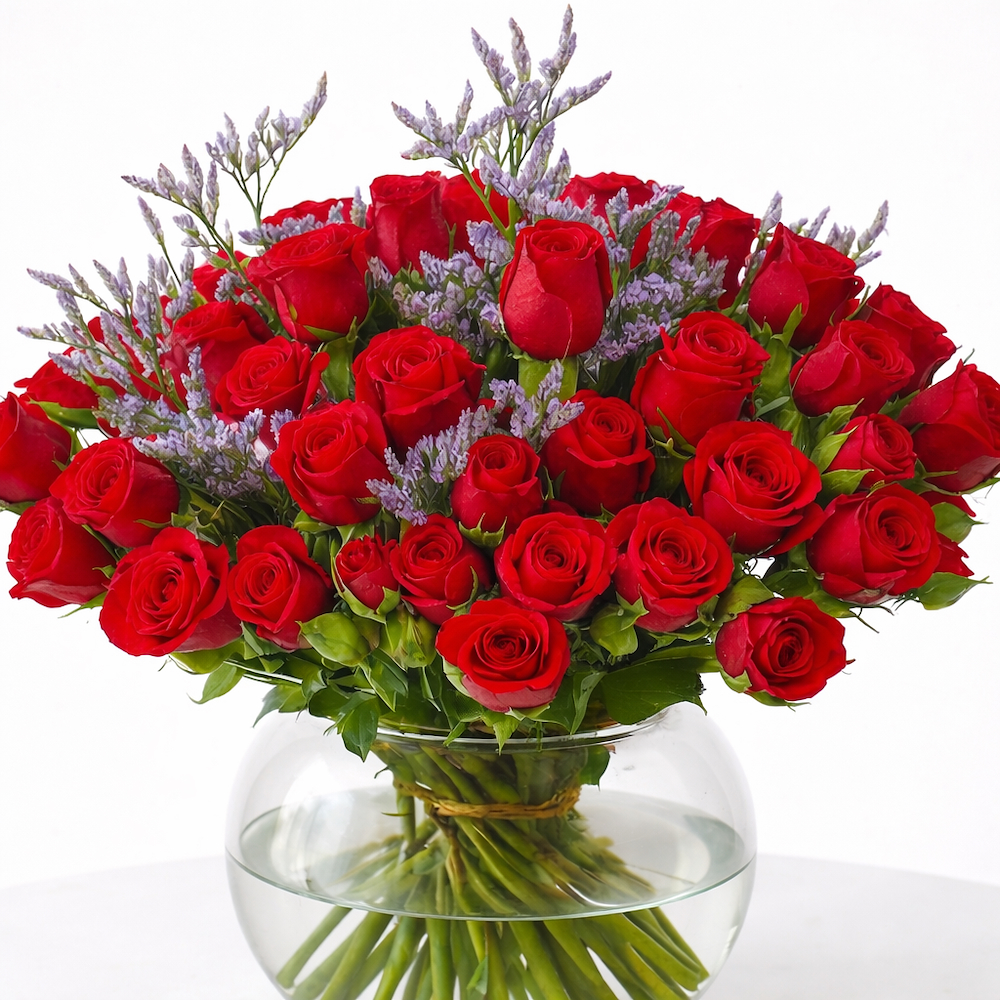 A bouquet of natural roses and baby roses with aluminum, arranged in an elegant vase.
