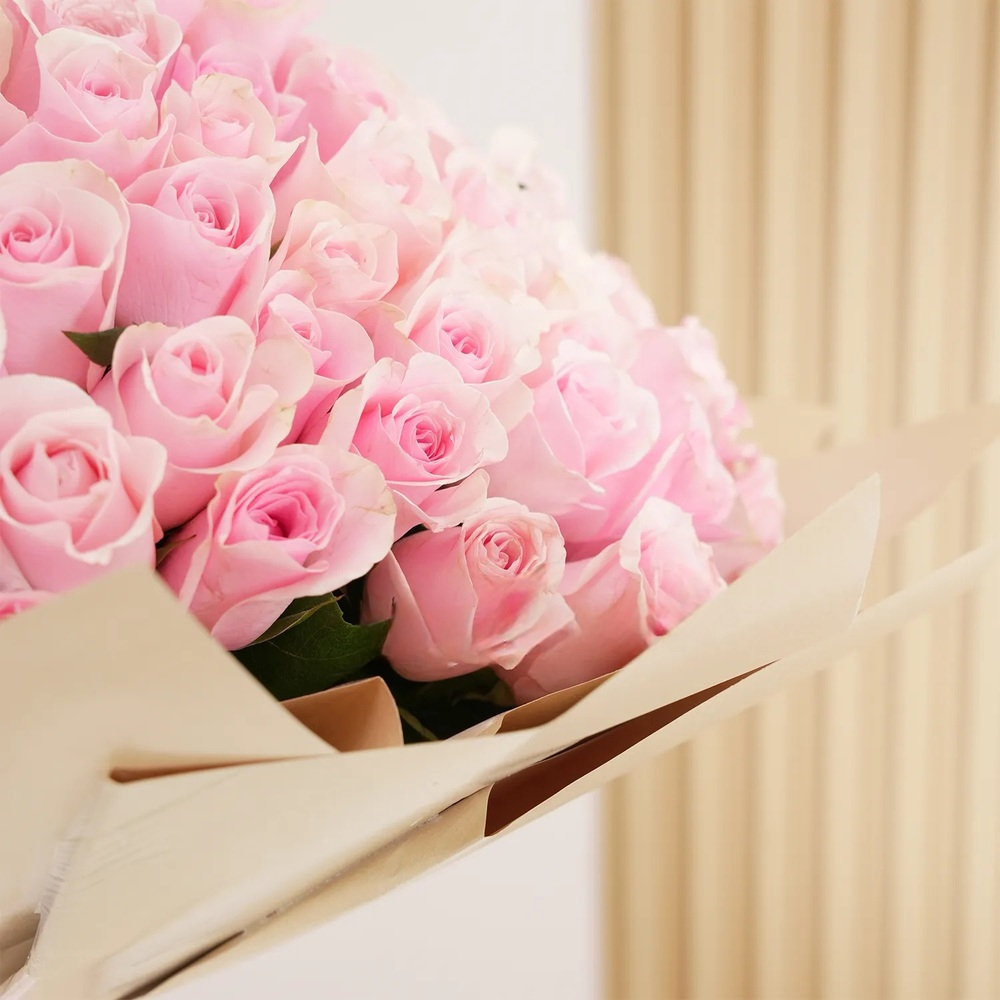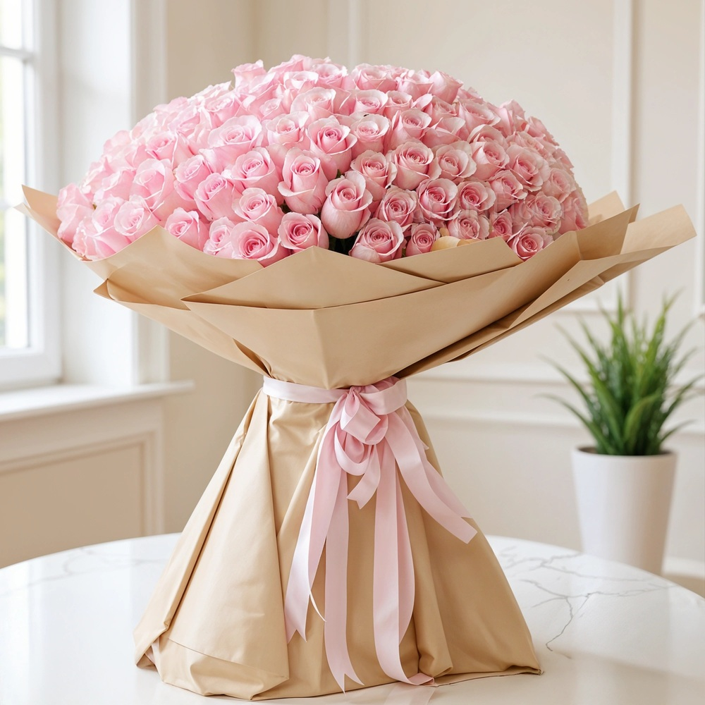 A hand bouquet containing 100 pink roses, arranged beautifully.