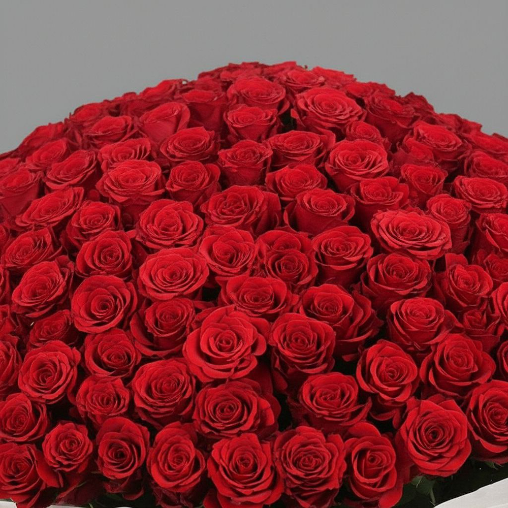 A bouquet of red roses, containing 150 roses, arranged elegantly.