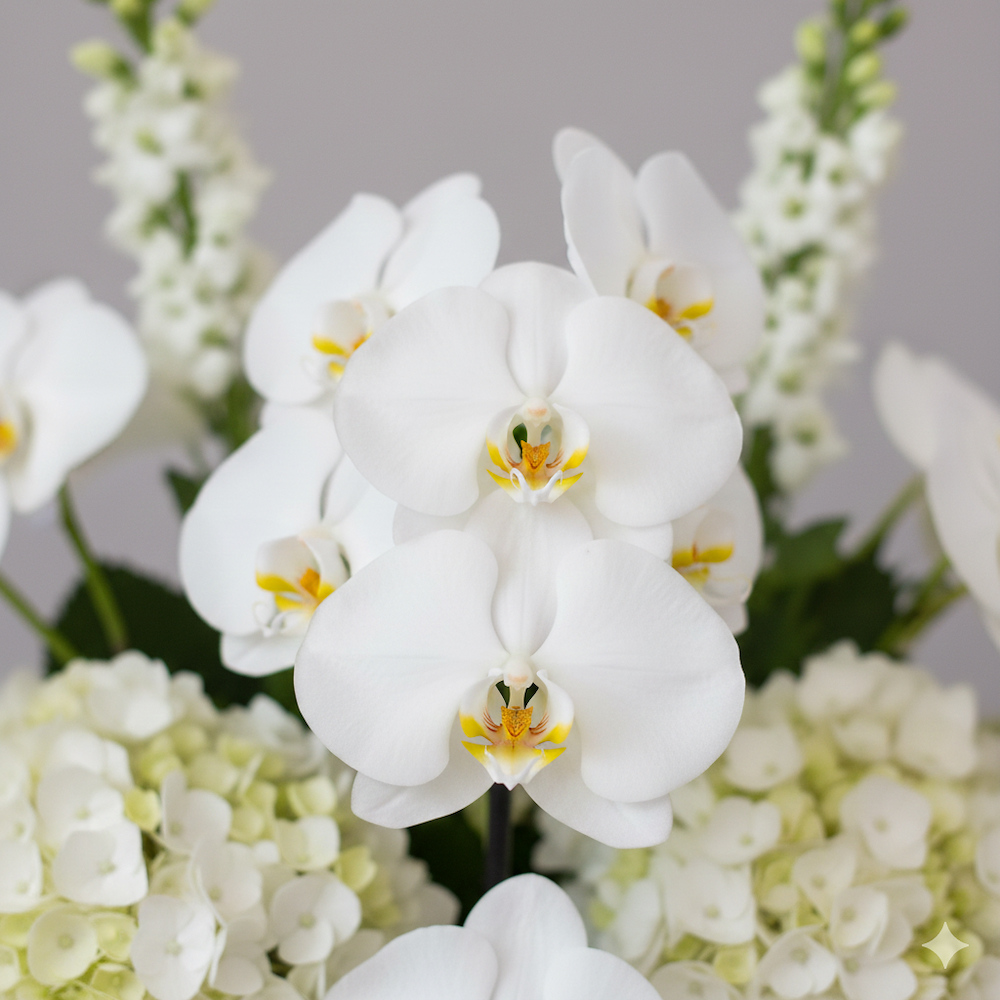 A bouquet containing hydrangeas, delphiniums, and orchids, arranged beautifully in a vase.