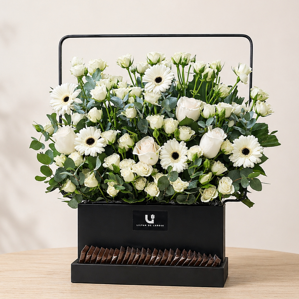A stand featuring baby roses, roses and gerberas with Belgian chocolates.