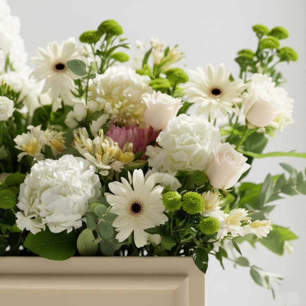 A wooden stand containing a mixture of natural flowers roses, baby roses, hydrangeas, delphiniums, and gerberas.