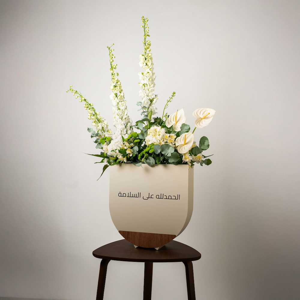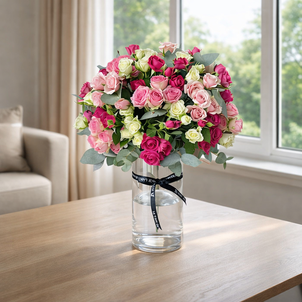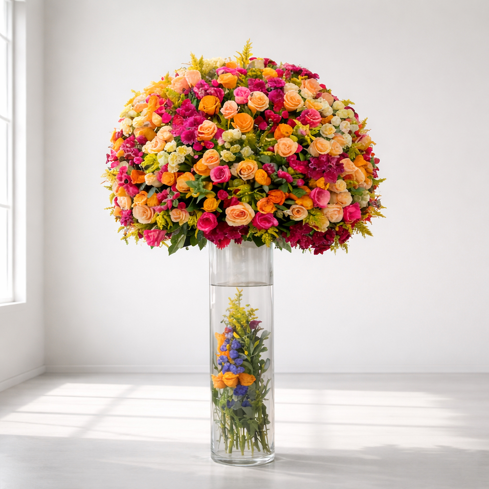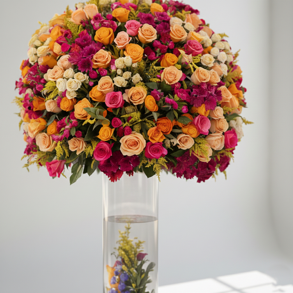 A large, elegantly arranged, spherical vase containing a mixture of flowers: roses, baby roses, chrysanthemum, solidago, and alstroemeria.