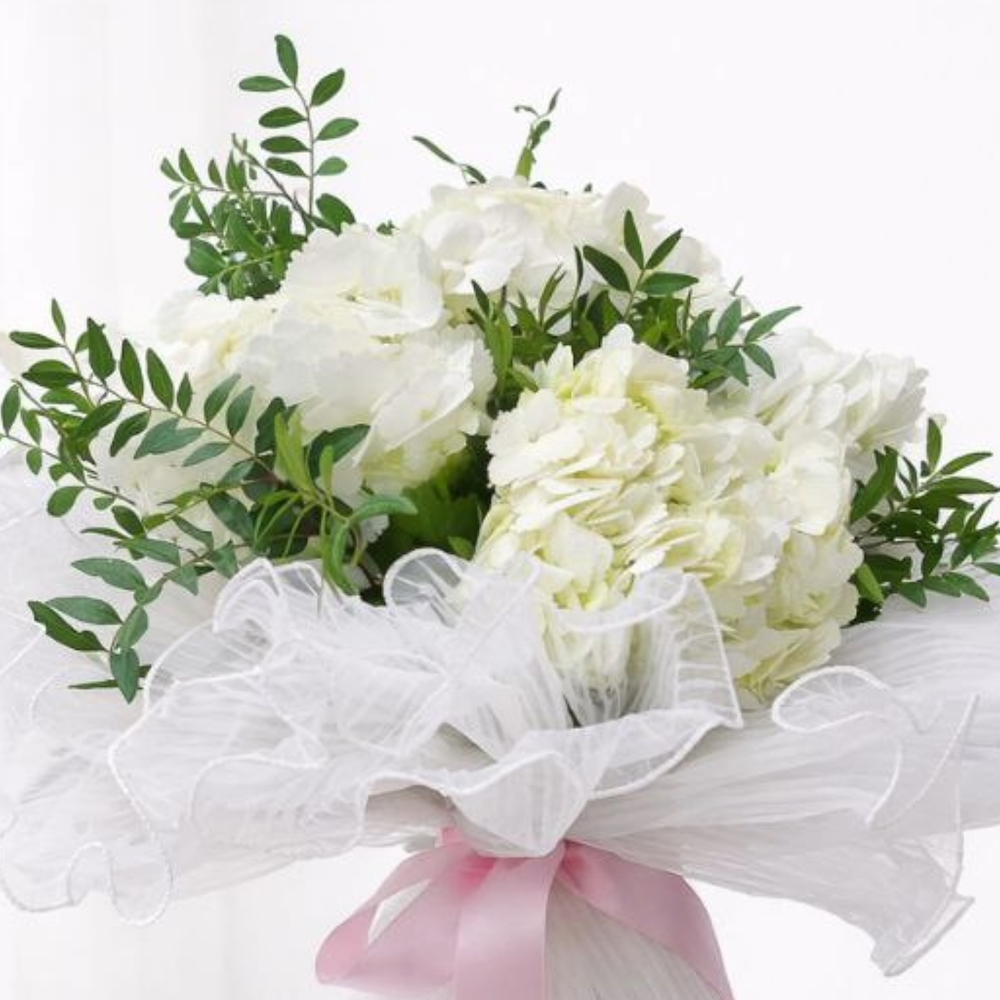 A beautifully arranged hand bouquet of natural hydrangeas.