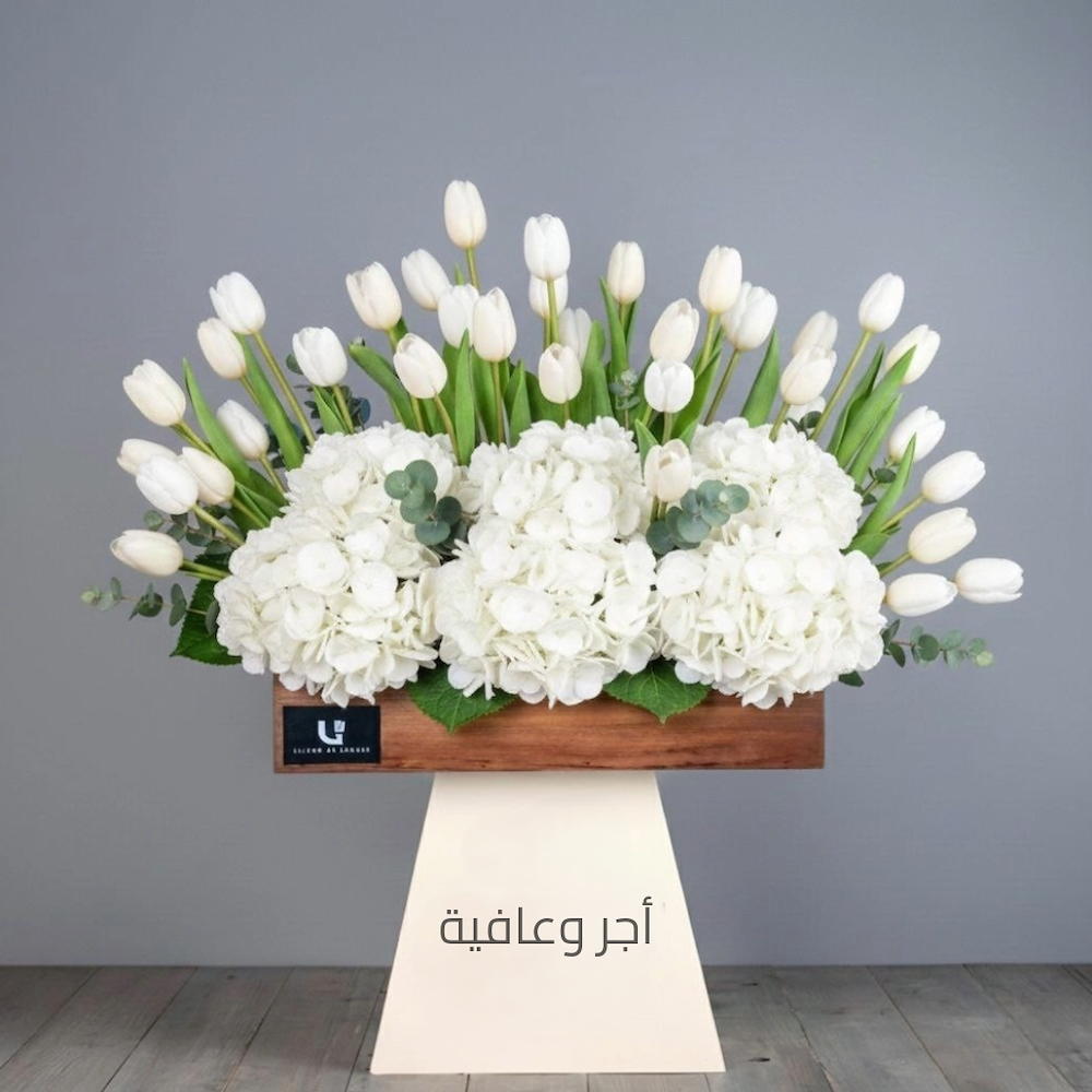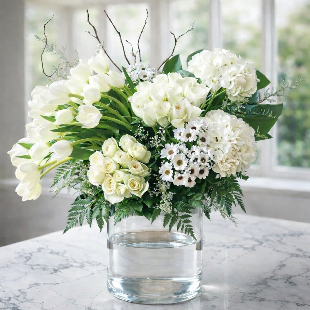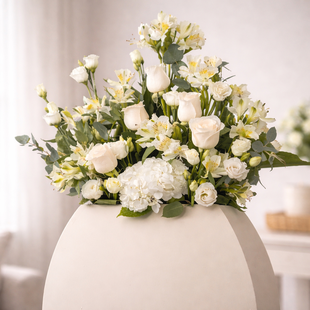 A stand arranged elegantly with roses, baby roses, alstroemerias, and hydrangeas.