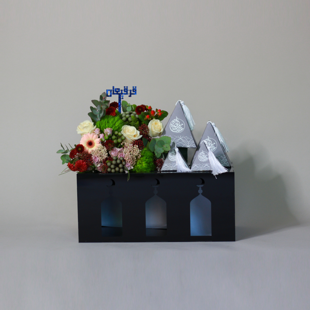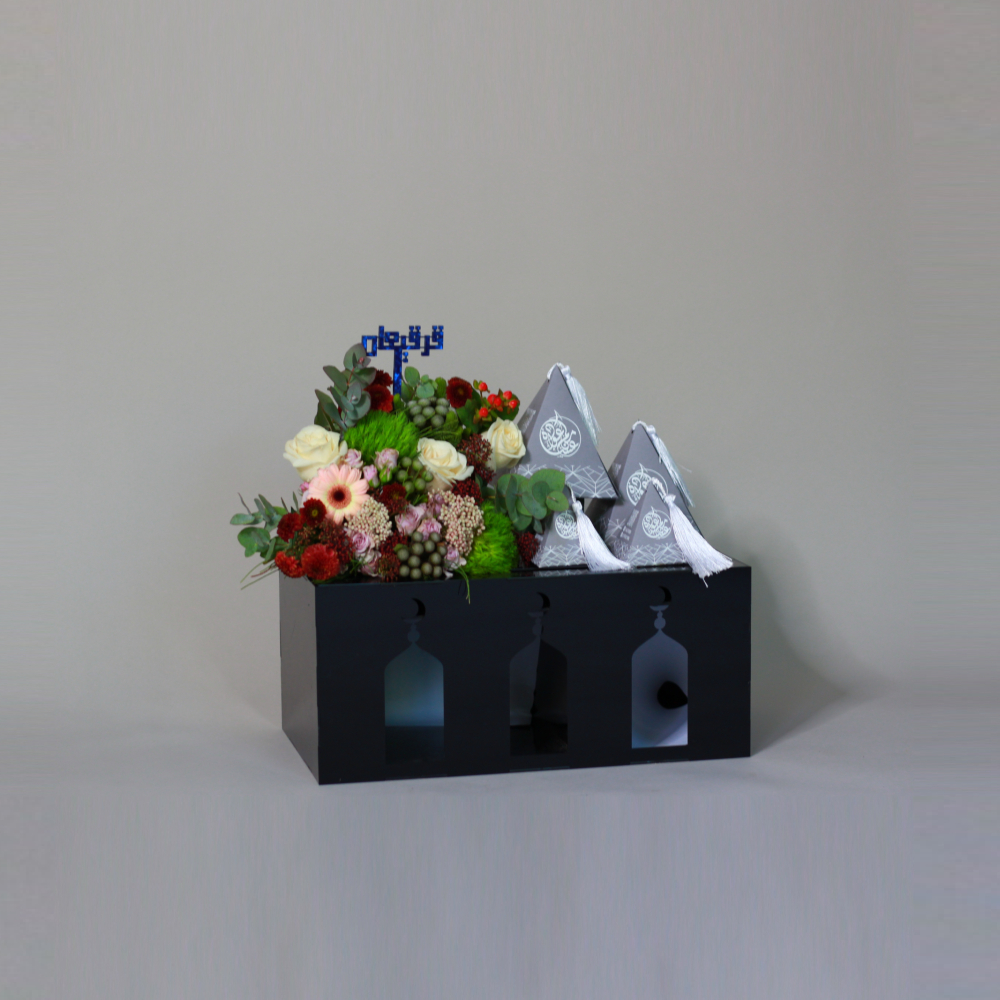 An elegant acrylic box, featuring 2 large Gergean pyramids and 2 small Gergean pyramids filled with mixed candies, comes with roses, gerbera, rice flower, hypericum, chrysanthemum flowers and eucalyptus leaves, topped with a mother of pearl Gergean topper.