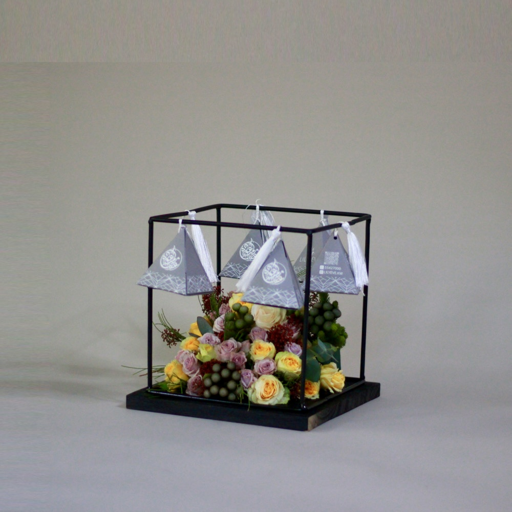 A metal stand, featuring baby roses, skimmia, and eucalyptus leaves with 6 hanging Gergean pyramids filled with mixed candies.