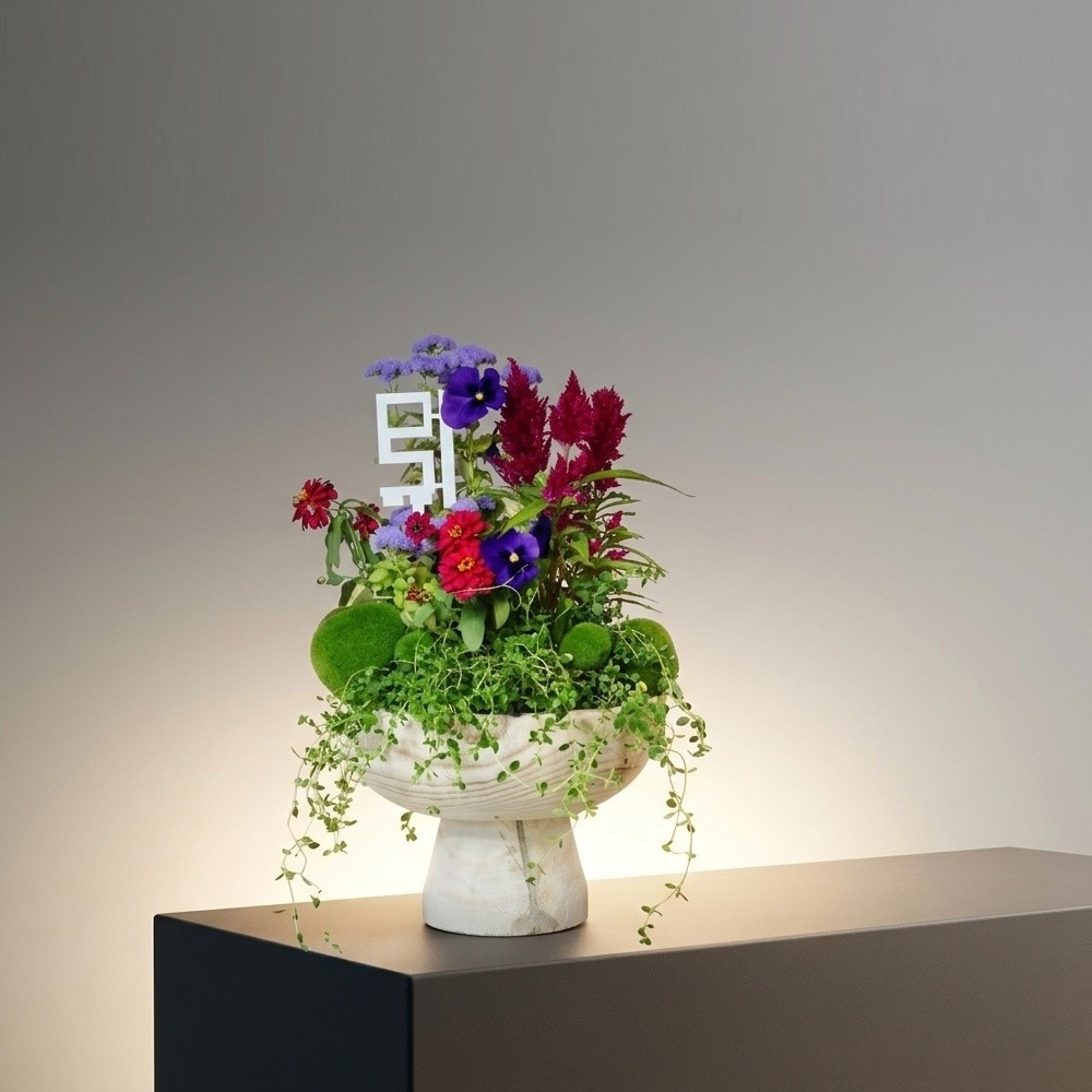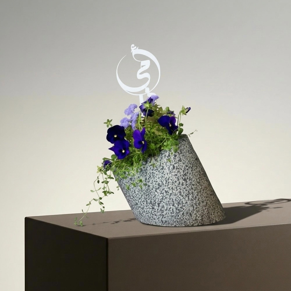 A glass vase with single face bouquet filled with baby roses, rice flowers, eryngium, baby pineapple, eucalyptus and waxflowers.