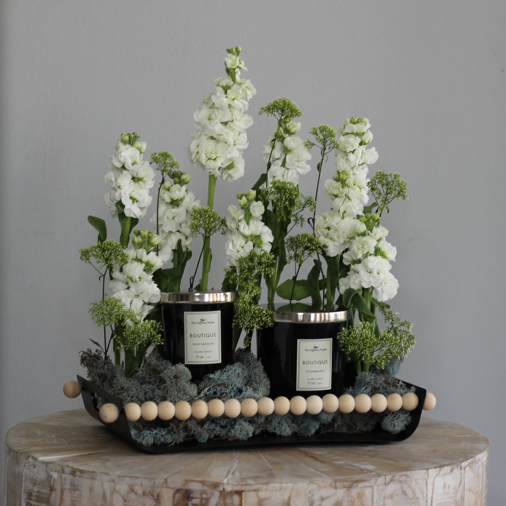 A bouquet containing matthiola, trachelium, and ice moss, arranged beautifully in a tray with glass candles.