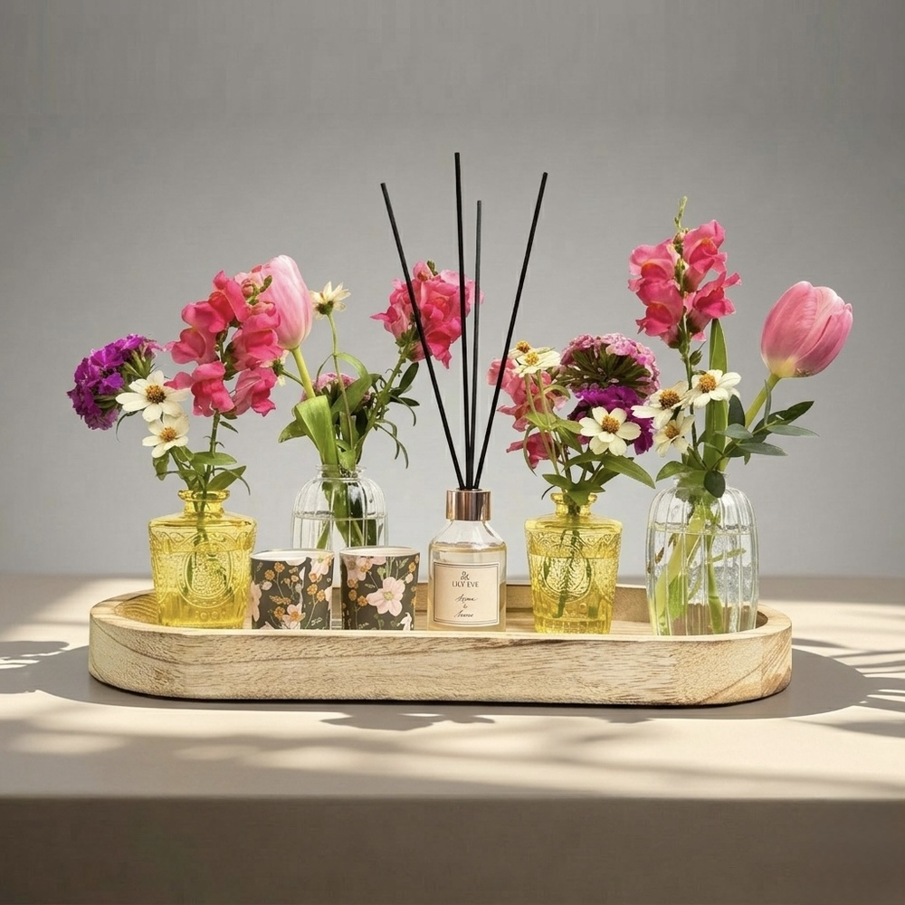 A wooden tray contains vases with snapdragon, zinnia, carnation, eucalyptus, and tulip with a diffuser and 2 candles.