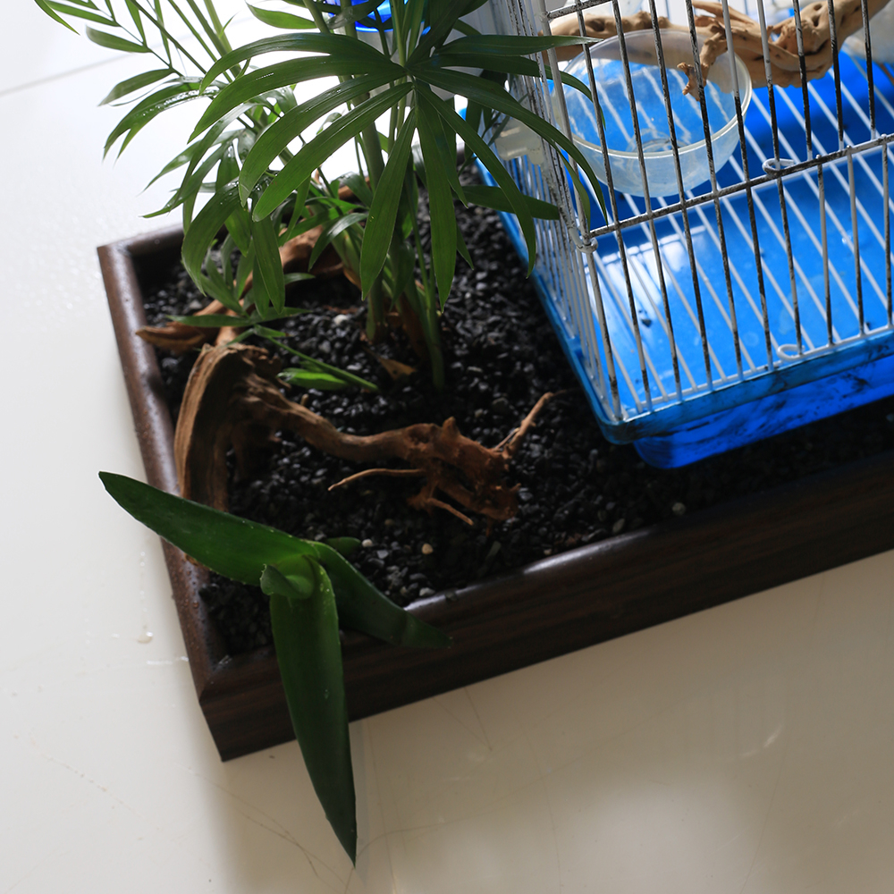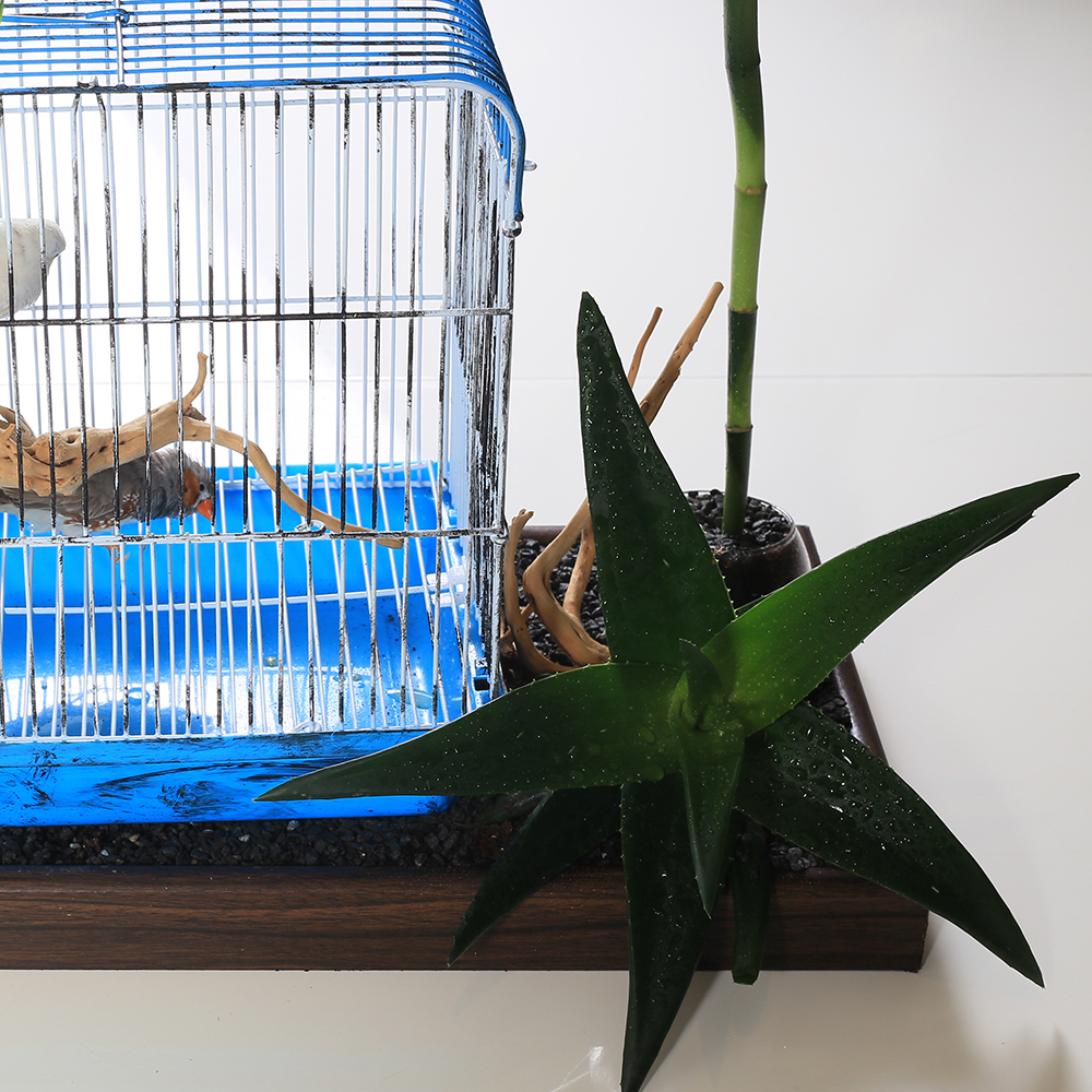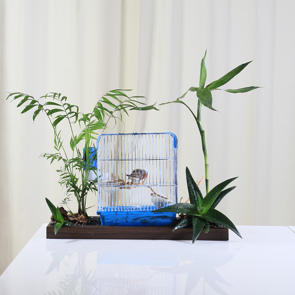 An elegant decorative piece that blends nature with life, featuring a small bird cage surrounded by lush green plants like chmaedorea, bamboo, and aloe vera plants, creating a calm and refreshing atmosphere with birds.
