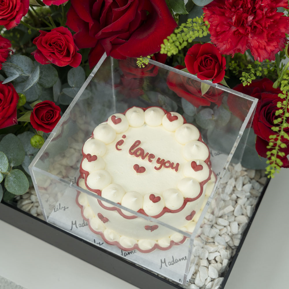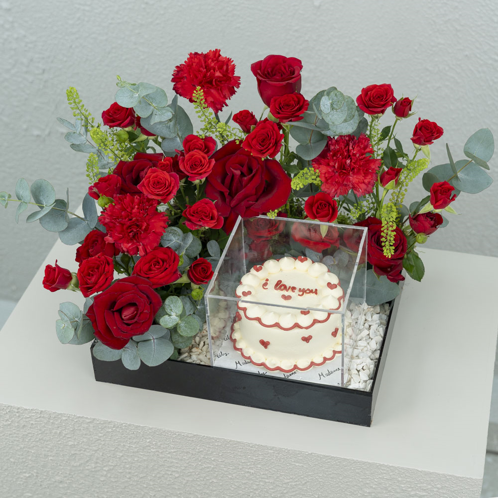 This bouquet contains roses and carnations with a chocolate cake.