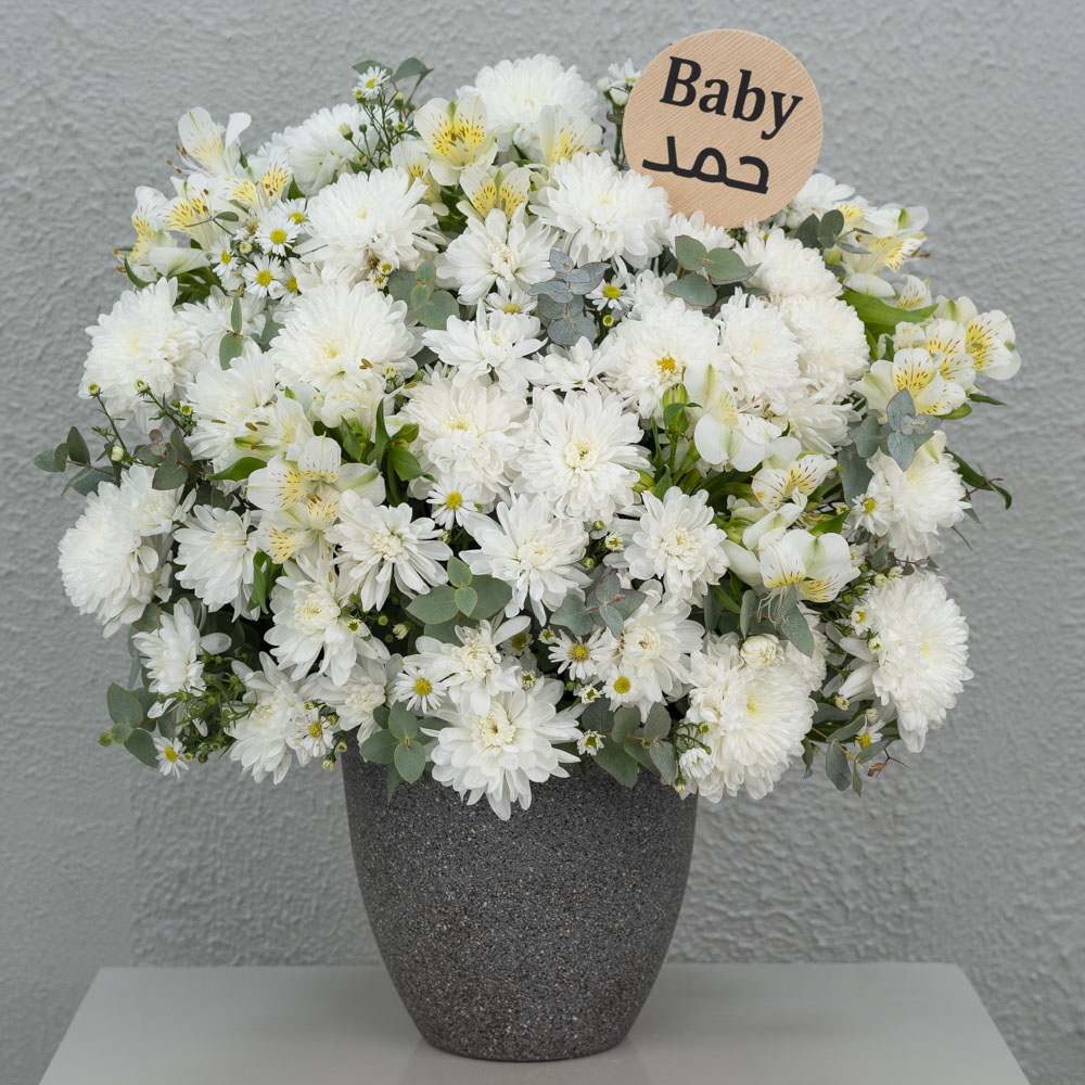 This bouquet contains white chrysanthemums and alstroemerias, arranged beautifully.