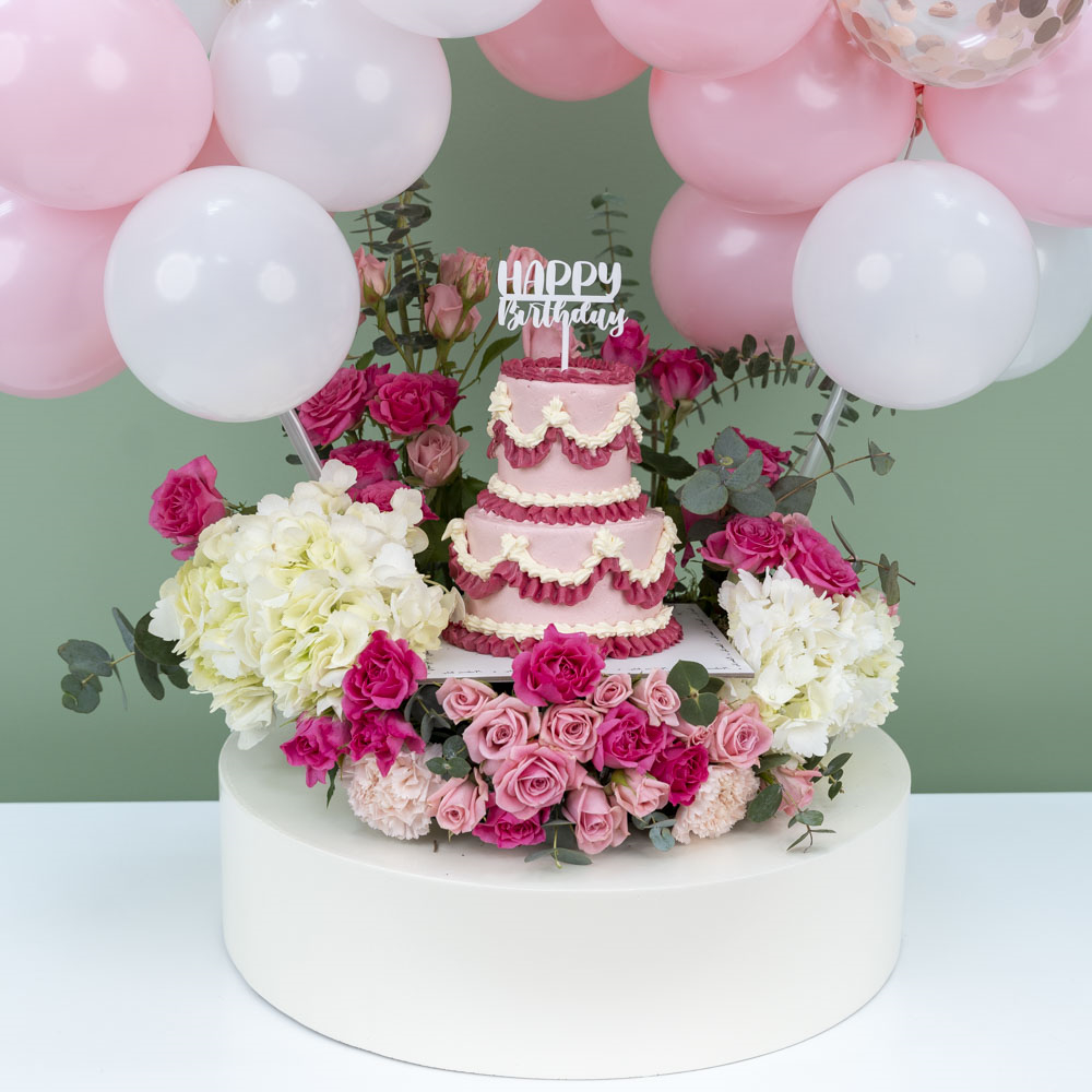 This bouquet contains carnations, hydrangeas, and baby roses with a chocolate cake.