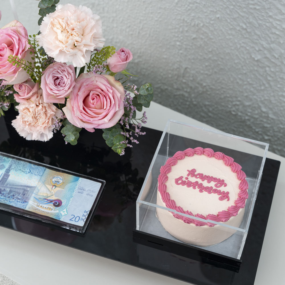 An acrylic tray decorated with baby roses, roses, and carnations, along with a balloon and a 4-inch chocolate cake. It includes a designated space for a cash gift. Note: Cash is not included.
