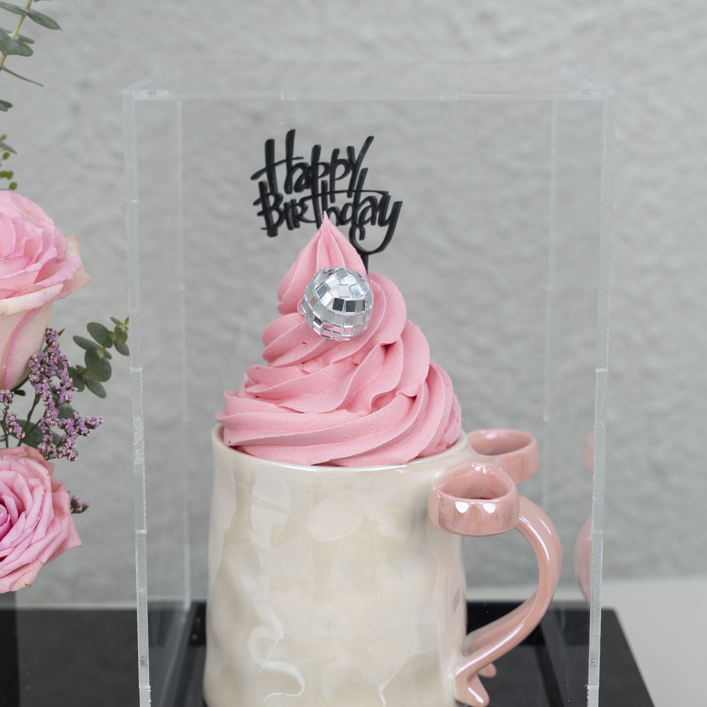 An acrylic tray decorated with roses, baby roses, carnations, and a balloon, along with a ceramic mug containing chocolate cake.