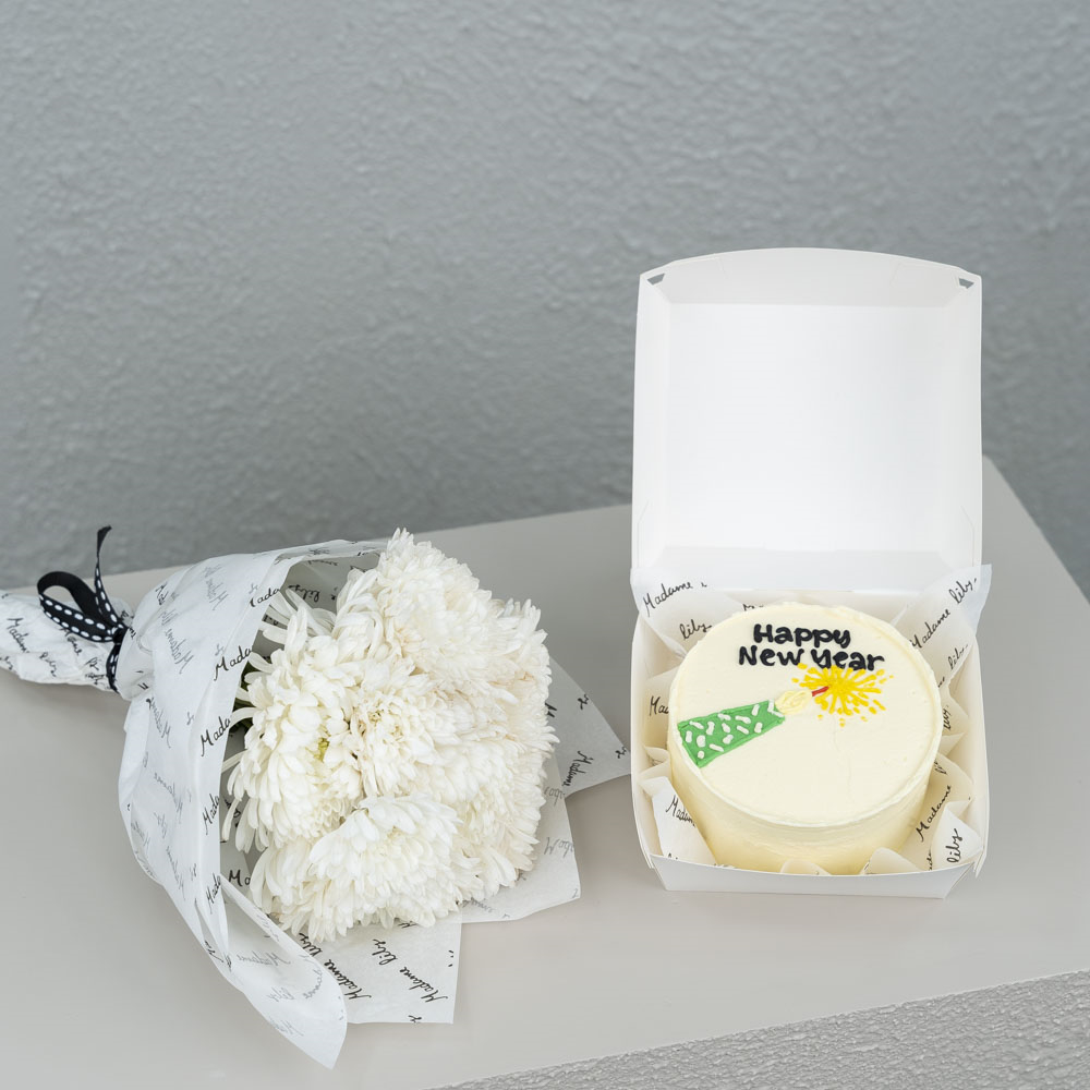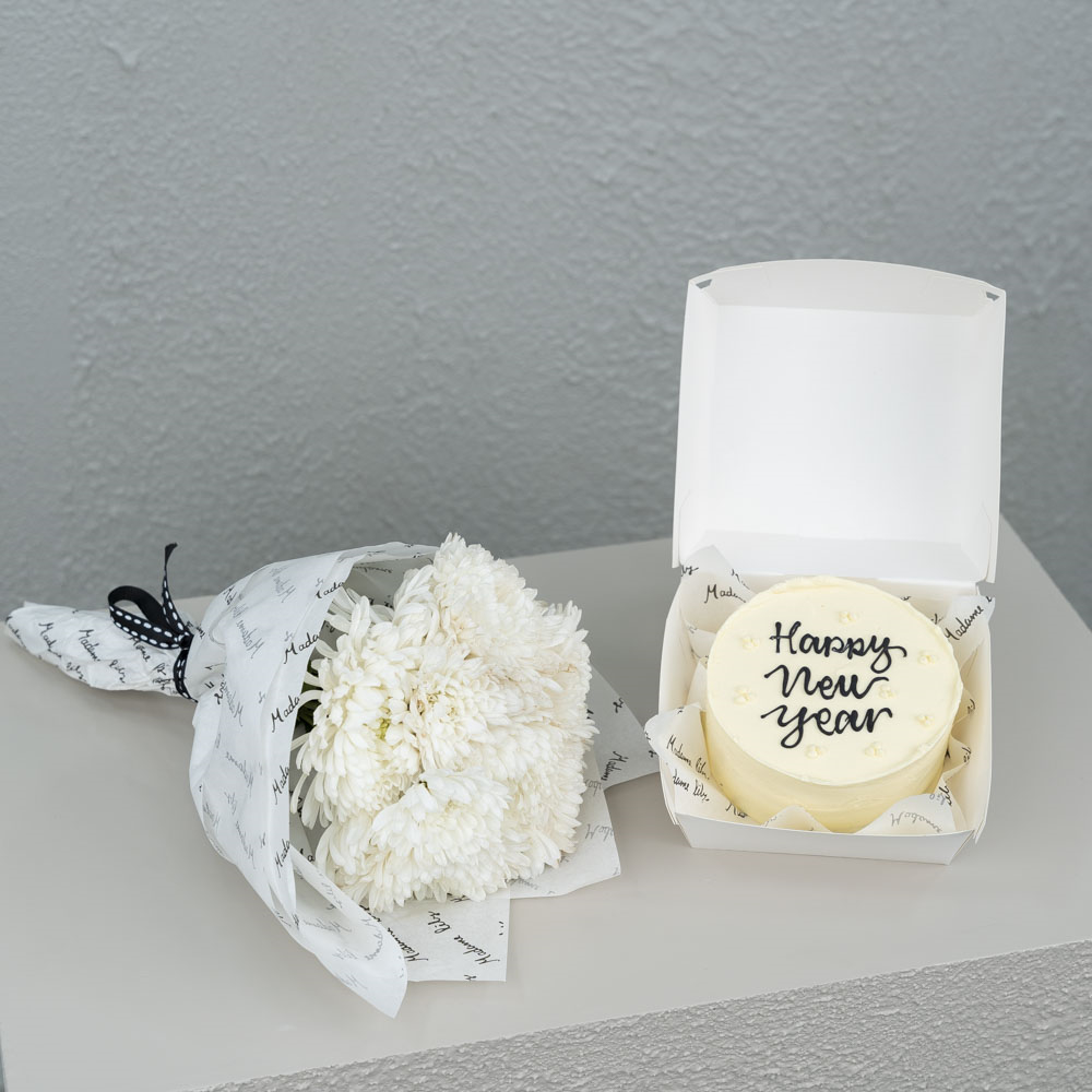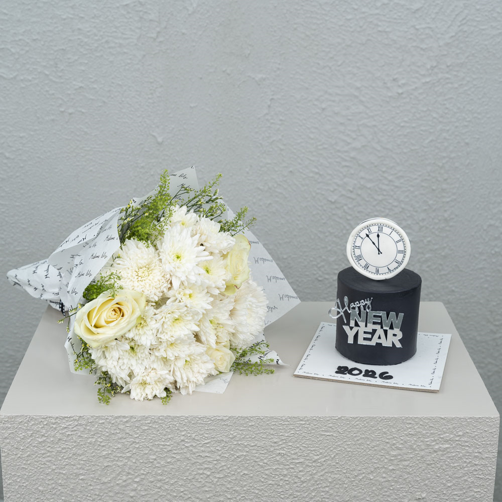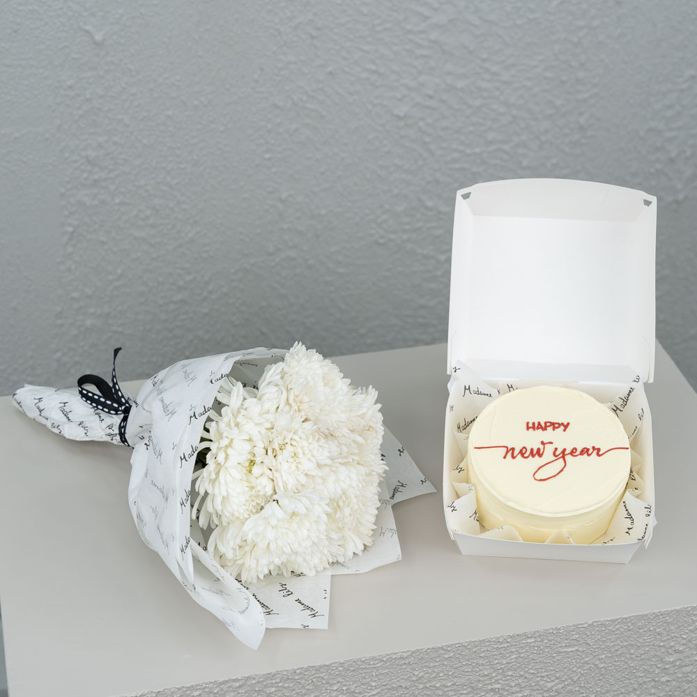 A bouquet that contains roses and chrysanthemums along with a chocolate cake.