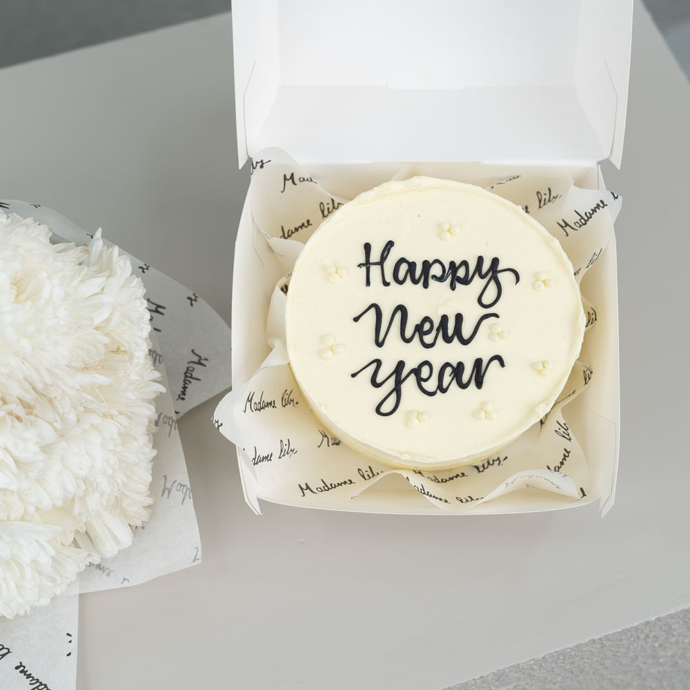 A bouquet that contains chrysanthemums along with a chocolate cake.