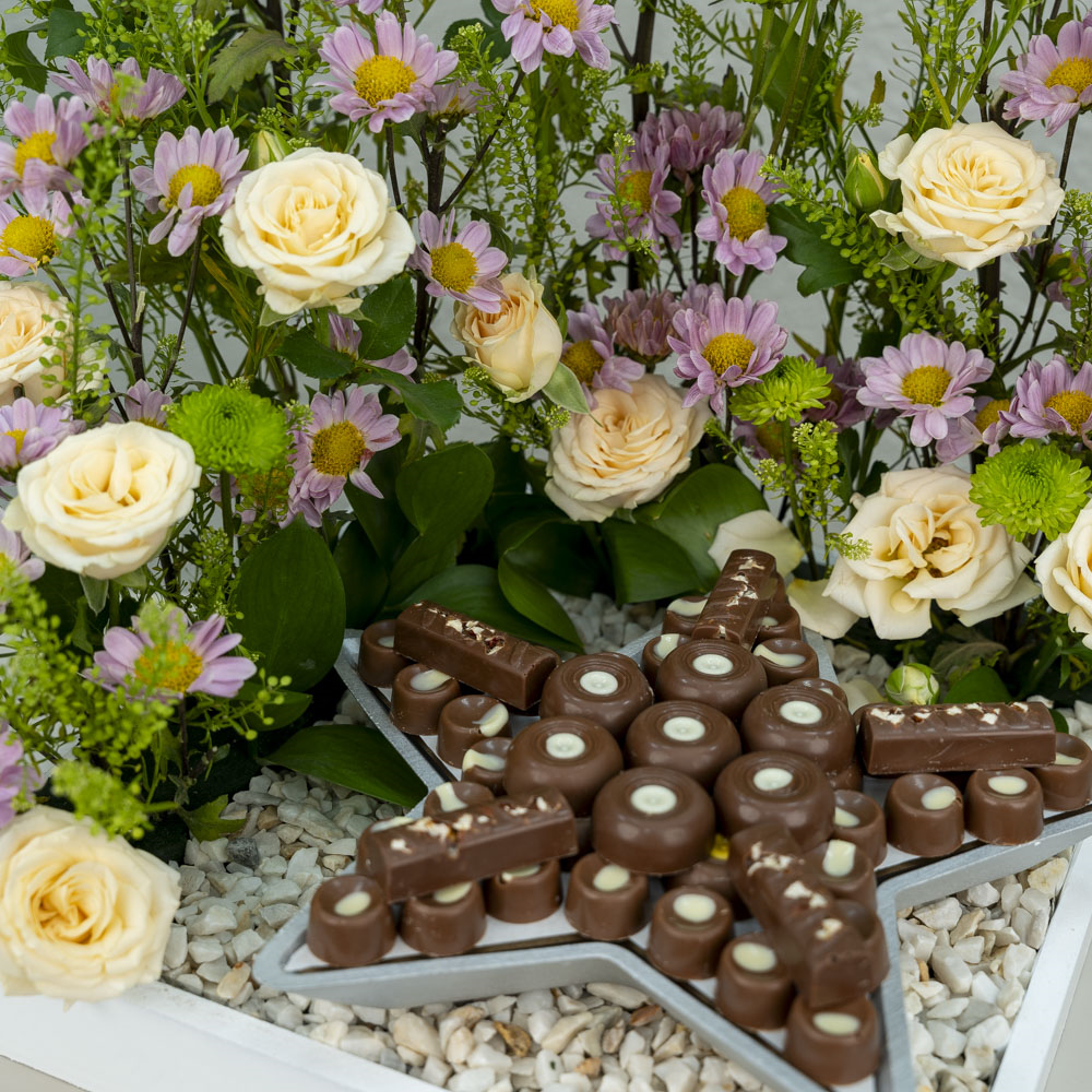 A wooden tray decorated with baby roses and chrysanthemums containing a multi-filled chocolate dish.
