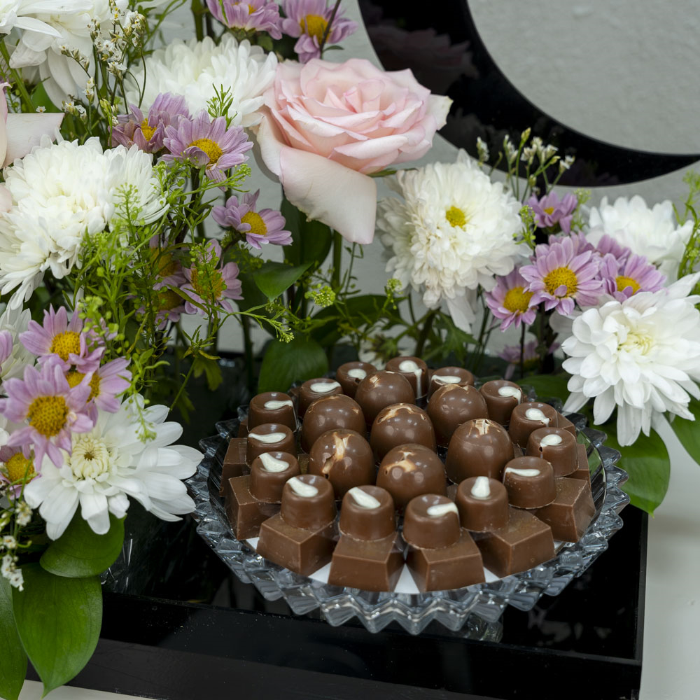 An acrylic tray decorated with roses and chrysanthemums containing a multi-filled chocolate dish.