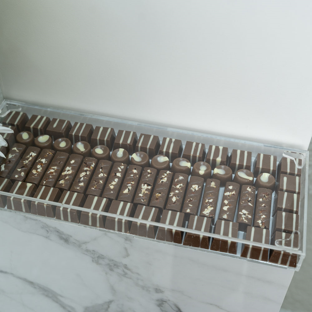 An elegant marble tray bouquet, featuring roses and chrysanthemum flowers with chocolates with mixed fillings.