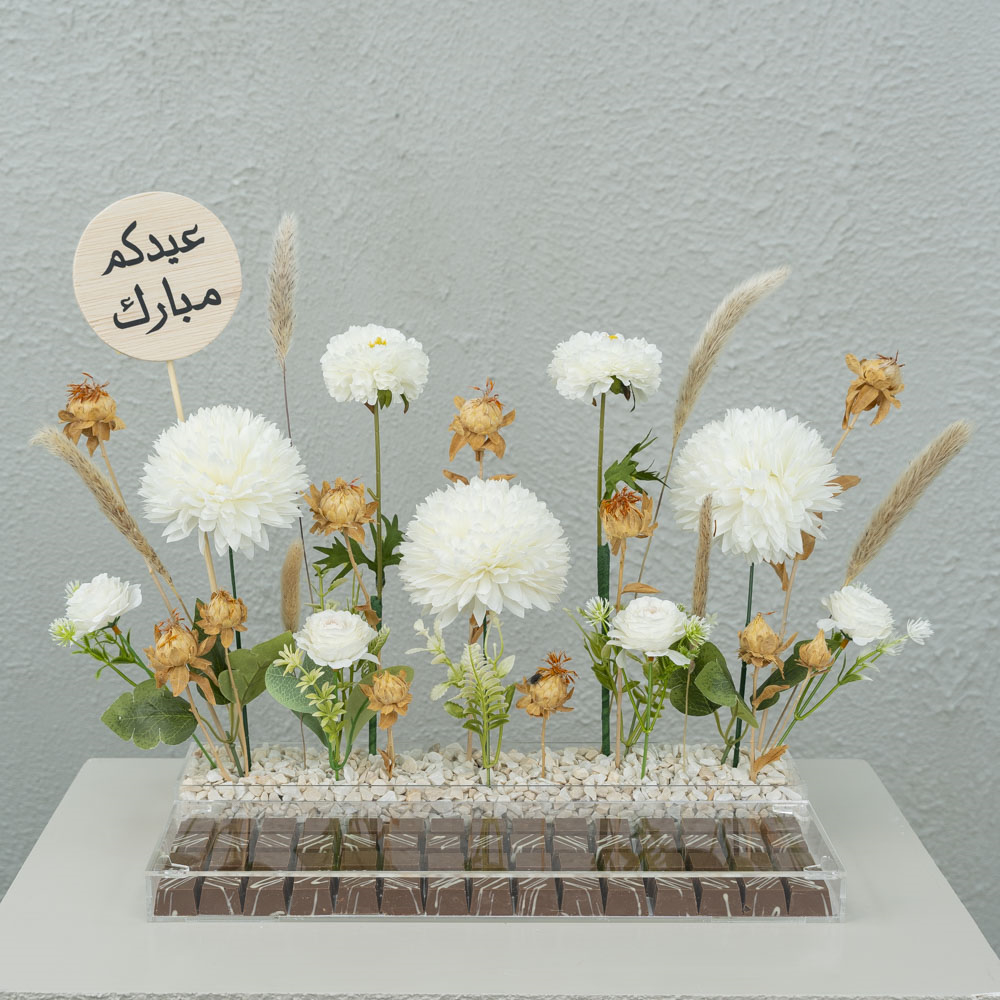 A beautifully designed acrylic box containing artificial flowers and delicious luxury chocolates.