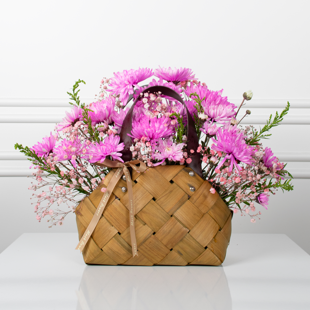 A basket that contains chrysanthemums and gypsophila.