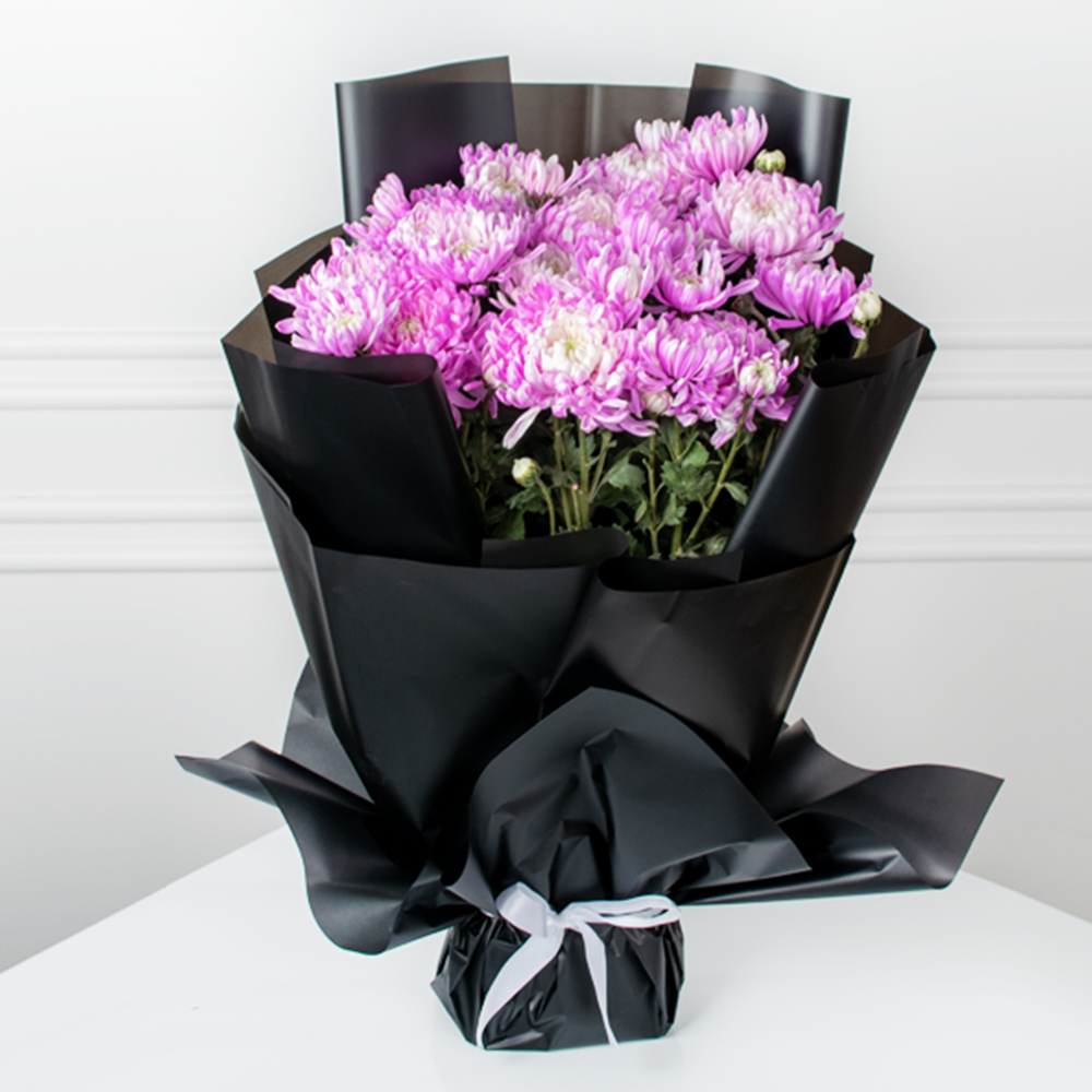 A beautifully arranged bouquet of purple chrysanthemum flowers in black wrapping.