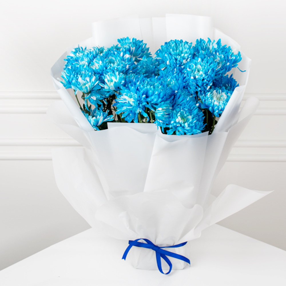 A beautifully arranged bouquet of blue chrysanthemum flowers in white wrapping.