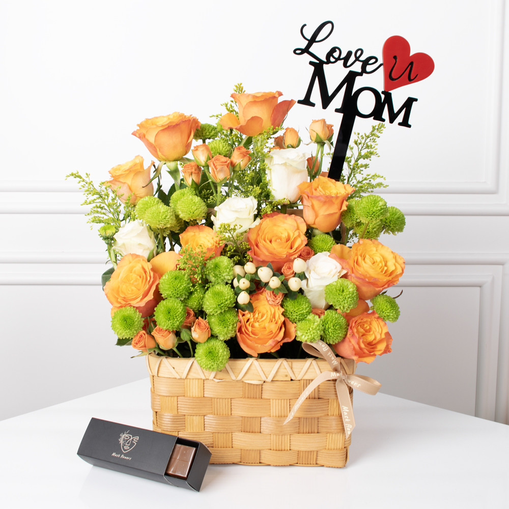 A beautifully arranged straw basket with orange and white roses, and green chrysanthemums, along with a small box of chocolates and an acrylic topper.
