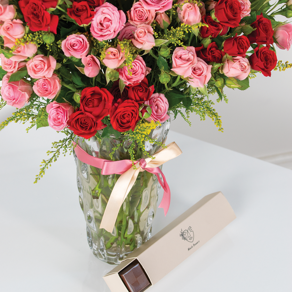A crystal vase filled with 20 baby roses with chocolates.