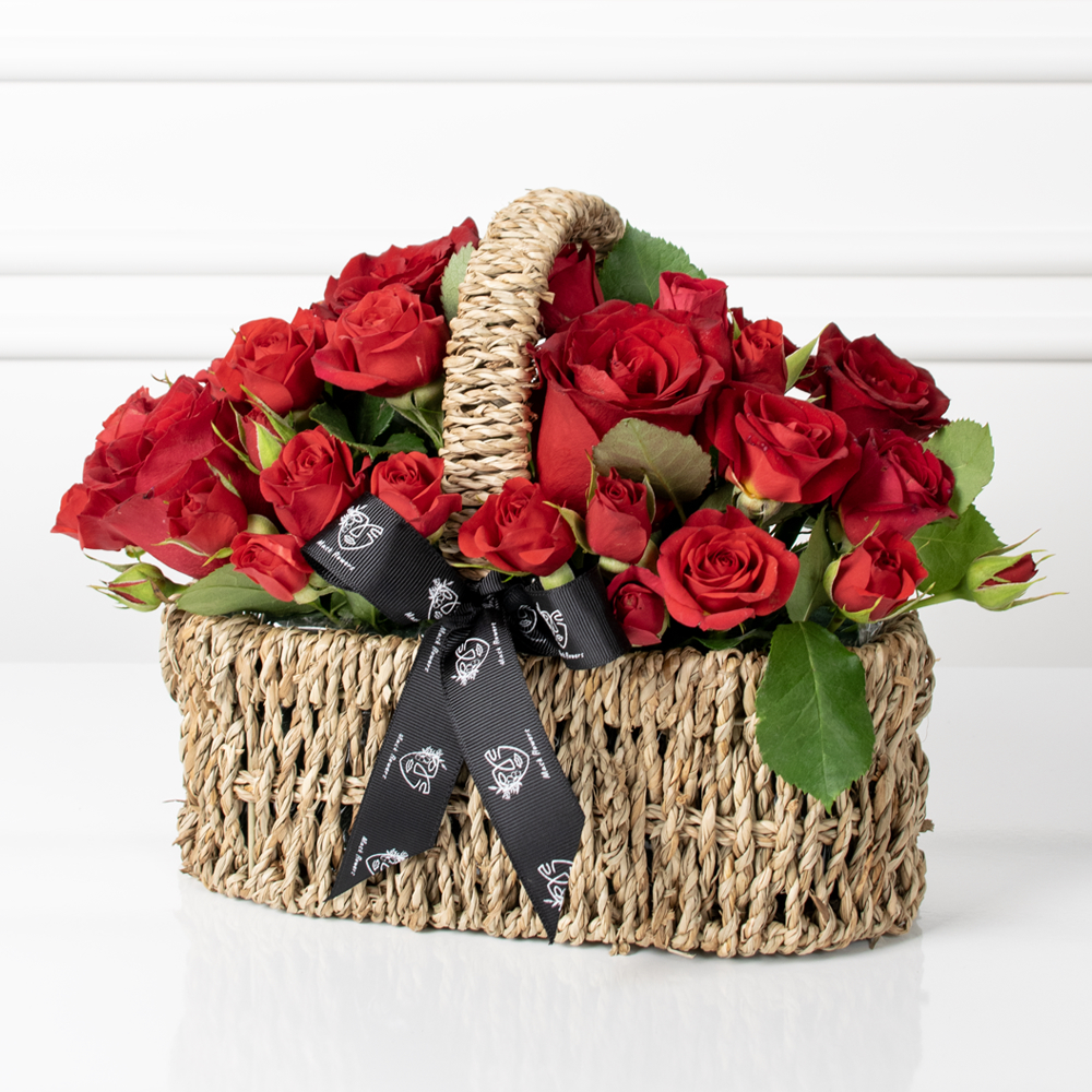 A straw basket featuring red roses and baby roses arranged beautifully.