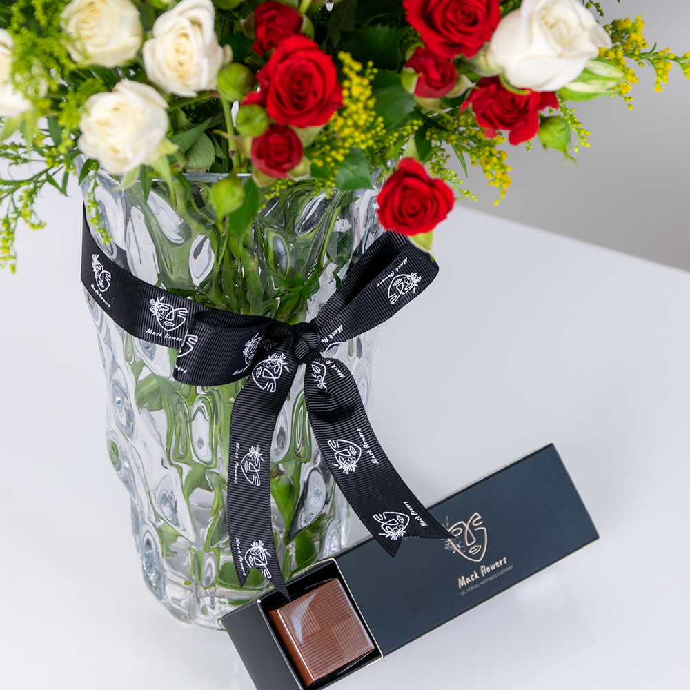 A crystal vase filled with 20 white & red baby roses with chocolates.