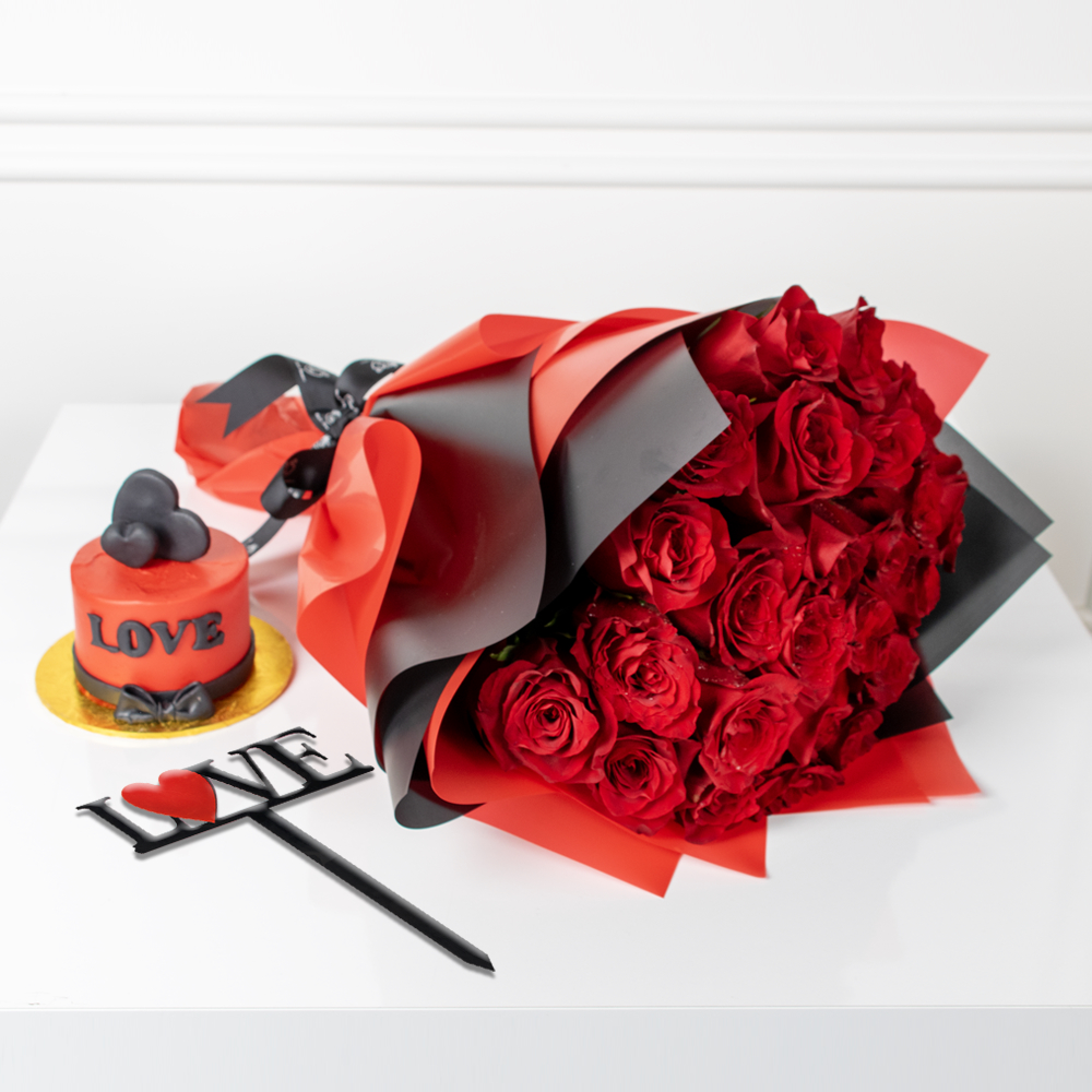An elegant bouquet featuring red roses, special wrapping, a mini caramel and chocolate cake, and an acrylic topper.