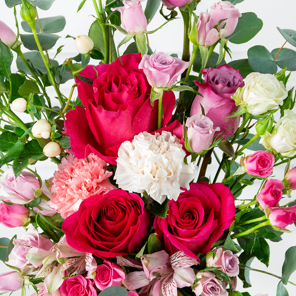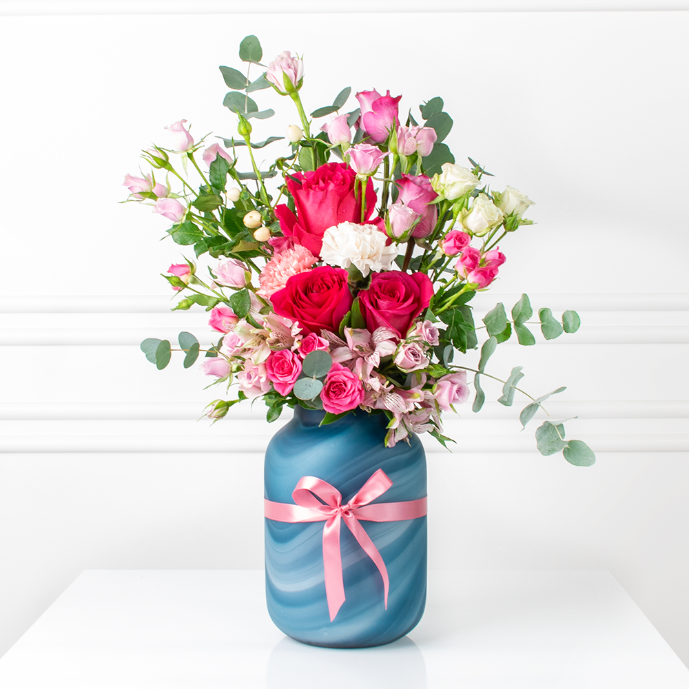 A decorative vase filled with baby roses, jasmine, and carnations, designed in soft floral tones and suitable for all occasions.