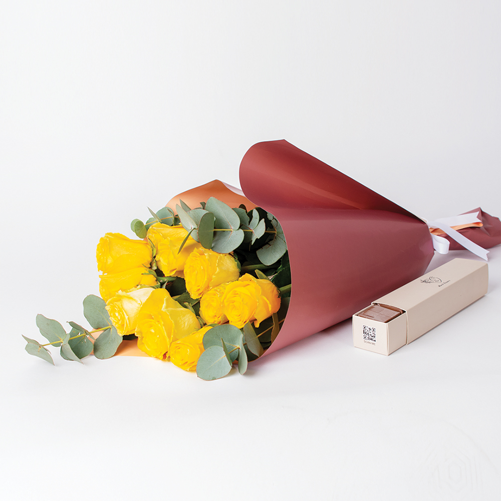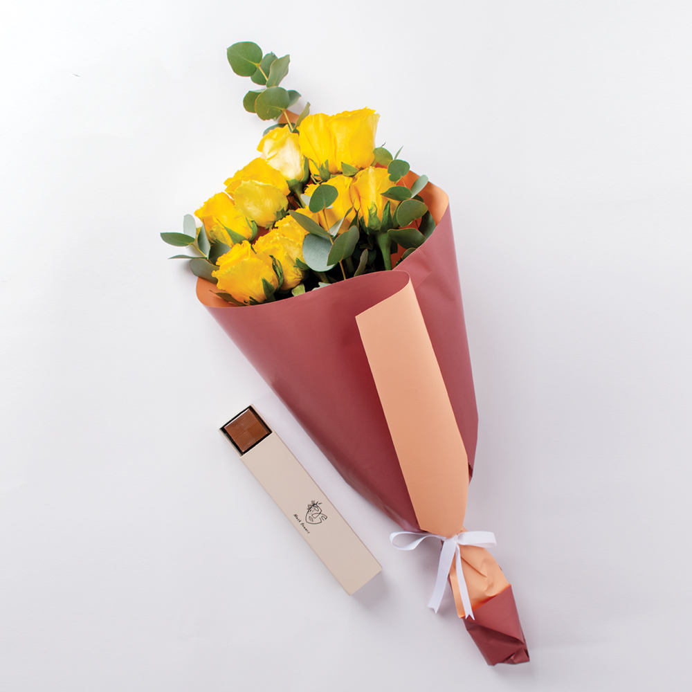 A hand bouquet filled with yellow roses with a box of chocolates.