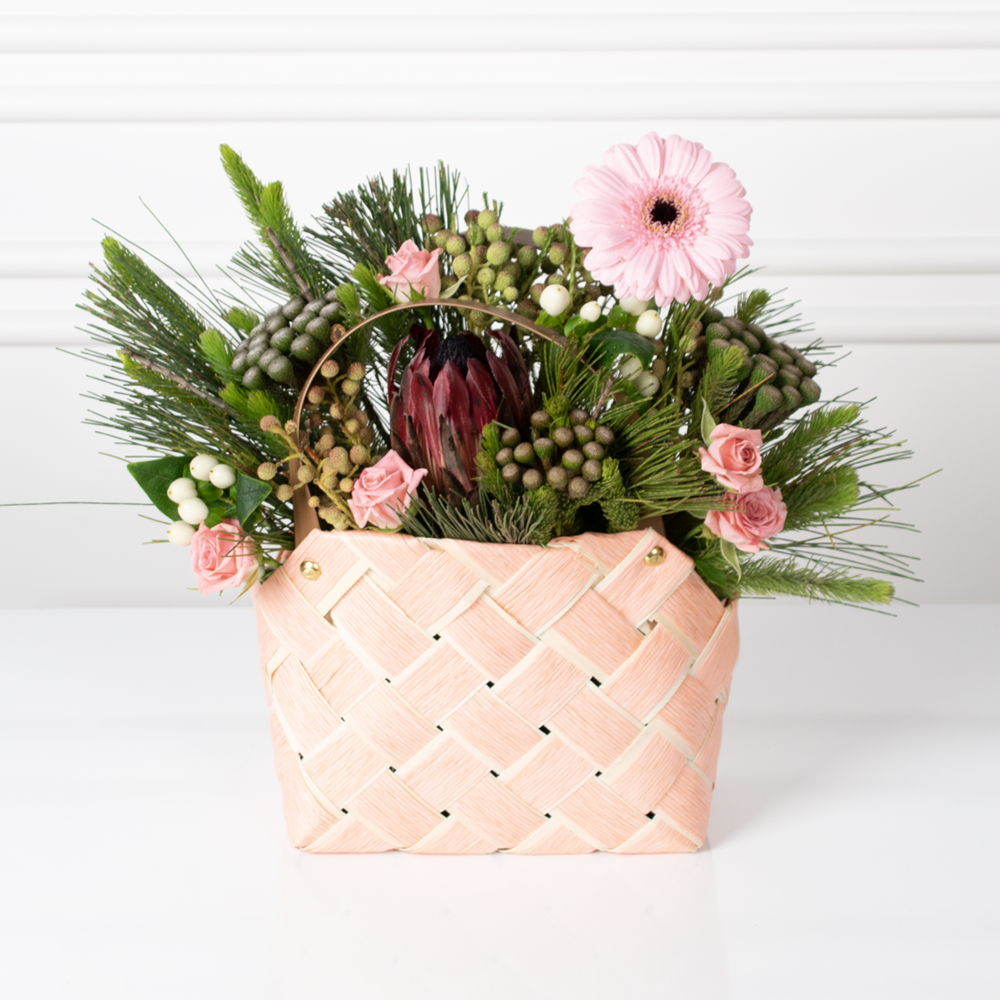 A beautifully arranged straw basket with Dutch safari flowers, baby roses, and gerberas.